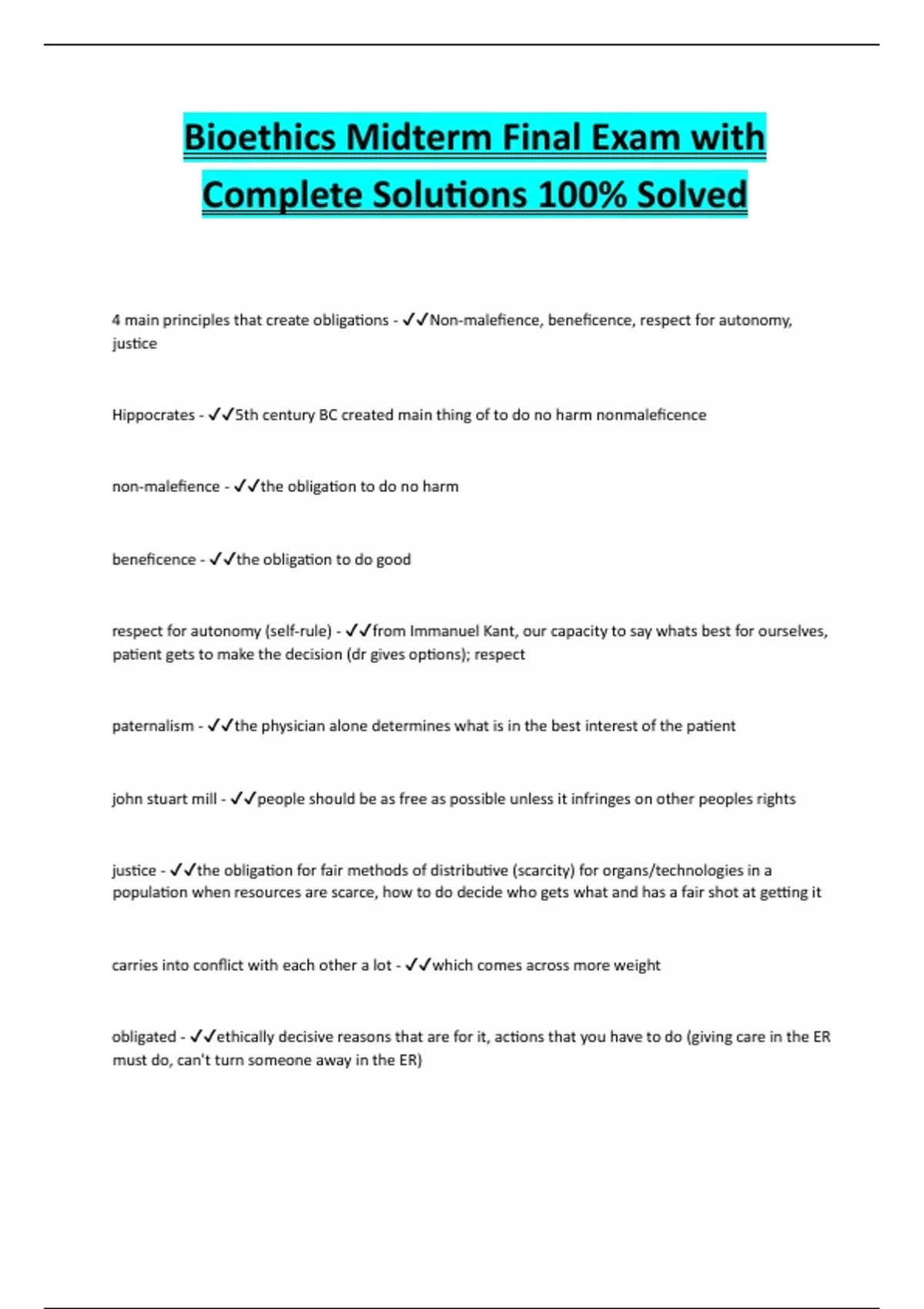 Bioethics Midterm Final Exam with Complete Solutions 100% Solved