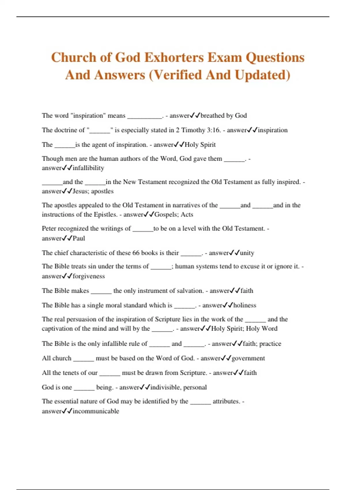 Church of God Exhorters Exam Questions And Answers (Verified And Updated) The word "inspiration" means __________. - answerbreathed by God The doctrine of "______" is especially stated in 2 Timothy 3:16. - answerinspiration The ______is the agent of inspiration. - answerHoly Spirit Though men are the human authors of the Word, God gave them ______. - answerinfallibility ______and the ______in the New Testament recognized the Old Testament as fully inspired. - answerJesus; apostles The apostles appealed to the Old Testament in narratives of the ______and ______and in the instructions of the Epistles. - answerGospels; Acts Peter recognized the writings of ______to be on a level with the Old Testament. - answerPaul The chief characteristic of these 66 books is their ______. - answerunity The Bible treats sin under the terms of ______; human systems tend to excuse it or ignore it. - answerforgiveness The Bible makes ______ the only instrument of salvation. - answerfaith The Bible has a single moral standard which is ______. - answerholiness The real persuasion of the inspiration of Scripture lies in the work of the ______ and the captivation of the mind and will by the ______. - answerHoly Spirit; Holy Word The Bible is the only infallible rule of ______ and ______. - answerfaith; practice All church ______ must be based on the Word of God. - answergovernment All the tenets of our ______ must be drawn from Scripture. - answerfaith God is one ______ being. - answerindivisible, personal The essential nature of God may be identified by the ______ attributes. - answerincommunicable The incommunicable attributes are His ______. - answerself-existence, unchangeableness, and infinity The personal nature of God may be identified by His ______ attributes. - answercommunicable These communicable attributes are God's ______ nature, His ______ nature, and His ______ nature. - answerintellectual; volitional; moral The distinction of the ______ is that He had begotten the Son from eternity. - answerFather The distinction of the ______ is that He had been begotten by the Father from eternity. - answerSon The distinction of the ______ is that He proceeds from the Father and the Son from eternity. - answerHoly Spirit The qualities of ______ belong to each of the persons of the Trinity. - answerdivine nature In describing the deity of the Trinity, we refer to each person as ______. - answerinfinite, eternal, and unchangeable The persons of the Trinity are the same in ______ and equal in ______, ______, and honor. - answersubstance; power; glory The earliest indications of the doctrine of the Trinity appear in the ______. - answerOld Testament The term "Trinity" emphasizes the two facets of this doctrine; they are the doctrine of ______ and the doctrine of ______ of God. - answerunity; tri-personalness Deuteronomy 6:4 emphasizes the ______ of God. - answerunity In ______, Solomon spoke of Jehovah as the only God. - answer1 Kings 8:60 In 1 Corinthians 8:6, Paul spoke of one ______ and one ______. - answerGod the Father; Lord Jesus Christ In 1 Timothy 2:5, the oneness of God is based on the fact that there is but one ______. - answerMediator According to James 2:19, even the devils believe that there is ______. - answerone God In Genesis 1:1, the word ______ implies the doctrine of the Trinity. - answerElohim God recognized the plurality in the Godhead by His use of the pronouns ______ and ______ in Genesis 1:26. - answerus; our
