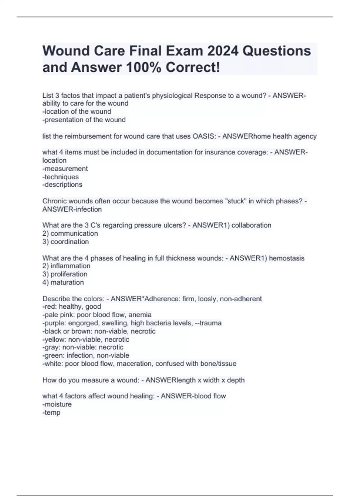 Wound Care Final Exam 2024 Questions and Answer 10List 3 factos that impact a patient's physiological Response to a wound? - ANSWER-ability to care for the wound -location of the wound -presentation of the wound list the reimbursement for wound care that uses OASIS: - ANSWERhome health agency what 4 items must be included in documentation for insurance coverage: - ANSWER-location -measurement -techniques -descriptions Chronic wounds often occur because the wound becomes "stuck" in which phases? - ANSWER-infection What are the 3 C's regarding pressure ulcers? - ANSWER1) collaboration 2) communication 3) coordination What are the 4 phases of healing in full thickness wounds: - ANSWER1) hemostasis 2) inflammation 3) proliferation 4) maturation Describe the colors: - ANSWER*Adherence: firm, loosly, non-adherent -red: healthy, good -pale pink: poor blood flow, anemia -purple: engorged, swelling, high bacteria levels, --trauma -black or brown: non-viable, necrotic -yellow: non-viable, necrotic -gray: non-viable: necrotic -green: infection, non-viable -white 0% Correct!