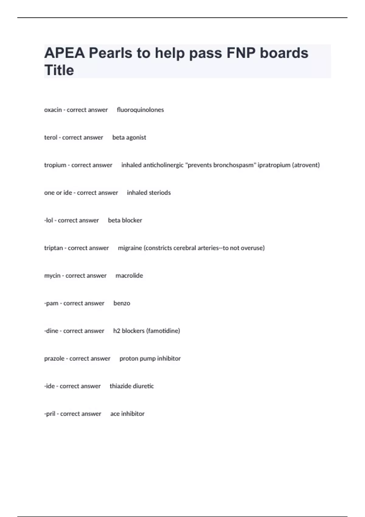 oxacin - correct answer fluoroquinolones terol - correct answer beta agonist tropium - correct answer inhaled anticholinergic "prevents bronchospasm" ipratropium (atrovent) one or ide - correct answer inhaled steriods -lol - correct answer beta blocker triptan - correct answer migraine (constricts cerebral arteries--to not overuse) mycin - correct answer macrolide -pam - correct answer benzo -dine - correct answer h2 blockers (famotidine) prazole - correct answer proton pump inhibitor -ide - correct answer thiazide diuretic -pril - correct answer ace inhibitor -sartan - correct answer ARB -lol - correct answer Beta Blocker -pine - correct answer calcium channel blocker---first line for ISH -gliptan - correct answer diabetic med--no hypoglycemia -sin - correct answer alpha adrenergic blockers (tx BPH) 4 indications for cxr with acute cough - correct answer abnormal VS rales, consolidation >75 years old fever Who gets PPSV23 vaccine?? - correct answer -single dose 65 or older -single dose 19-64 if chronic illness, smoker, group home -Immunocompromised receive another dose at 5 YEAR interval -ALWAYS get dose at 65 even if received earlier doses as long as 5 Years has passed!! Bacteria responsible for most pneumonia deaths - correct answer Strep pneumonae (Gram -) Three most common bacteria - CAP - correct answer S. Pneumoniae Mycoplasma pneumoniae (walking pneumonia) Chlamydophila pneumoniae Best initial antibiotics for pneumonia if no antibiotic exposure in last 3 months - correct answer Doxycycine or Macrolide (Azithromycin or Clarithromycin) ----because they cover for atypicals Best initial antibiotics for pneumonia if comorbidities or antibiotics in 90 days - correct answer -Resp quinolone (levofloxacin, gemifloxacin, moxifloxacin) or IF ALLERGY -Beta-lactam (PCN or cephalosporin) PLUS macrolide How long course of antibiotics for pneumonia - correct answer 3 days longer than s/s of infection. Pneumonia severity index??? - correct answer CRB-65 -Confusion -RR >30 -BP low -Age >65 What confirms COPD on PFTs??? - correct answer FEV1/FVC <70% COPD staging - correct answer Bigger number more severe What med is crucial for COPD patient - correct answer SABA!! Where are beta1 receptors - correct answer Heart Where are beta2 receptors - correct answer Lungs What is the maintenance drug of choice for all levels of asthma? - correct answer Inhaled corticosteroid. What classifies persistent asthma ? - correct answer >2 days /wk symptoms; nighttime sx >3 x month How do postitive PPD readings differ for immunocompromixed patients? - correct answer smaller size of induration positive if immunocompromized (>15 mm if healthy, >5mm if HIV) What does Baciille Calmette Guerin vaccine protect against? - correct answer BCG vaccine for TB. Given in other countries. At what age should you do a f/u CXR after treatment for pneumonia - correct answer Anyone over 40 Possible sequelae of long term inhaled steroid use - correct answer cataract formation osteoporosis rising A1C What cardiac class is bad for COPD /Asthma - correct answer -lol; Beta Blockers...opposite affect of SABA and LABAs Which patients typically should have higher h&h??? - correct answer Hgh altitudes, smokers, COPDers What population "generally" has lower h&h? - correct answer >65 Range of "normocytic" MCV rbc - correct answer 80-90fl <80 microcytic >96 Macrocytic on a cbc, the size of rbc is described by the - correct answer MCV On a cbc, the hemoglobin content of RBCs is decribed by the - correct answer MCH (mean corpucular hgb) hypo/hyperchromic?? Normal Hgb - correct answer 11-15g/dl normal Hct - correct answer 33-45% RDW - wh