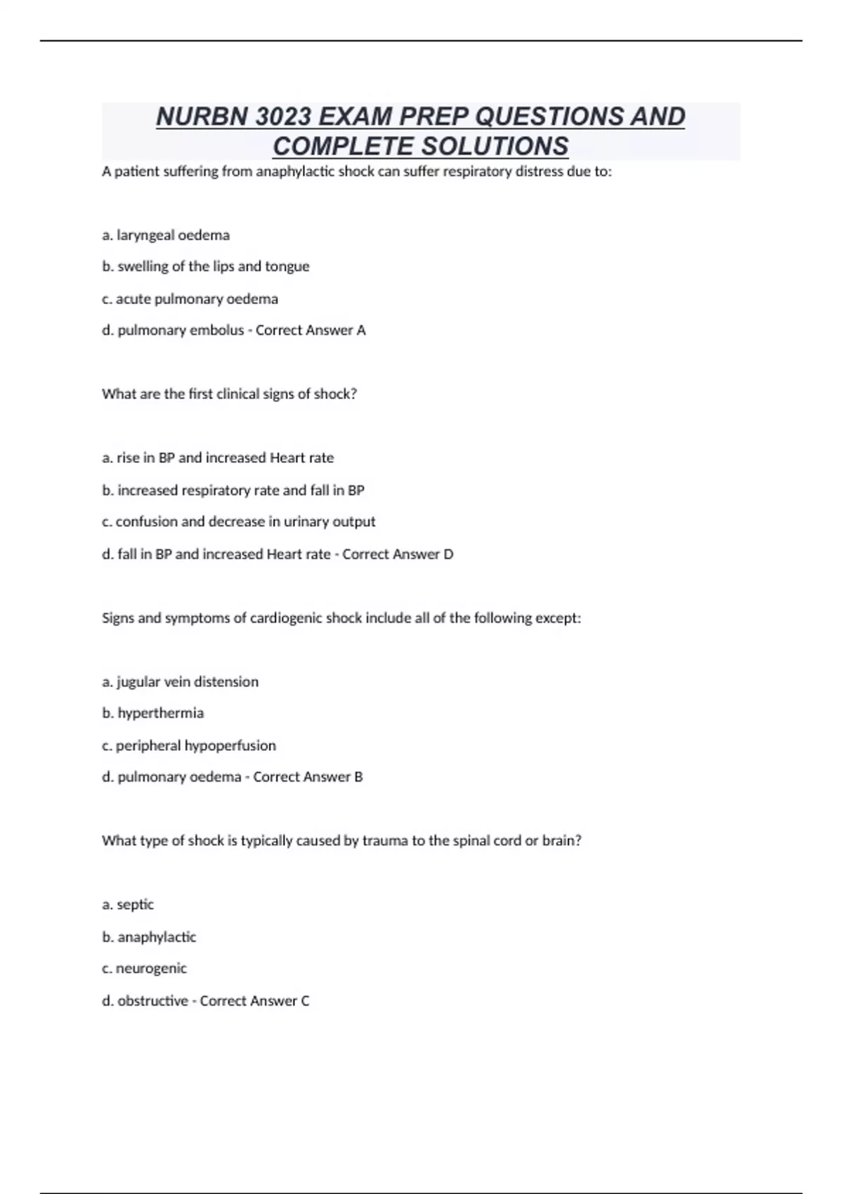 NURBN 3023 EXAM PREP QUESTIONS AND COMPLETE SOLUTIONS A patient suffering from anaphylactic shock can suffer respiratory distress due to: a. laryngeal oedema b. swelling of the lips and tongue c. acute pulmonary oedema d. pulmonary embolus - Correct Answer A What are the first clinical signs of shock? a. rise in BP and increased Heart rate b. increased respiratory rate and fall in BP c. confusion and decrease in urinary output d. fall in BP and increased Heart rate - Correct Answer D Signs and symptoms of cardiogenic shock include all of the following except: a. jugular vein distension b. hyperthermia c. peripheral hypoperfusion d. pulmonary oedema - Correct Answer B What type of shock is typically caused by trauma to the spinal cord or brain? a. septic b. anaphylactic c. neurogenic d. obstructive - Correct Answer C