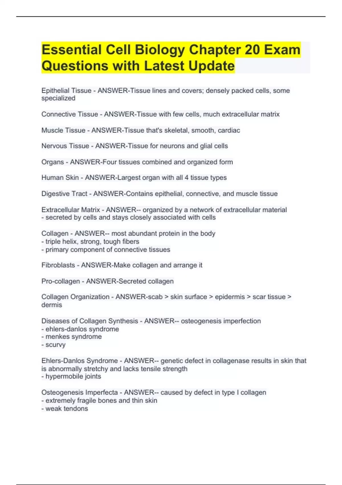 Epithelial Tissue - ANSWER-Tissue lines and covers; densely packed cells, some specialized Connective Tissue - ANSWER-Tissue with few cells, much extracellular matrix Muscle Tissue - ANSWER-Tissue that's skeletal, smooth, cardiac Nervous Tissue - ANSWER-Tissue for neurons and glial cells Organs - ANSWER-Four tissues combined and organized form Human Skin - ANSWER-Largest organ with all 4 tissue types Digestive Tract - ANSWER-Contains epithelial, connective, and muscle tissue Extracellular Matrix - ANSWER-- organized by a network of extracellular material - secreted by cells and stays closely associated with cells Collagen - ANSWER-- most abundant protein in the body - triple helix, strong, tough fibers - primary component of connective tissues Fibroblasts - ANSWER-Make collagen and arrange it Pro-collagen - ANSWER-Secreted collagen Collagen Organization - ANSWER-scab > skin surface > epidermis > scar tissue > dermis Diseases of Collagen Synthesis - ANSWER-- osteogenesis imperfection - ehlers-danlos syndrome - menkes syndrome - scurvy Ehlers-Danlos Syndrome - ANSWER-- genetic defect in collagenase results in skin that is abnormally stretchy and lacks tensile strength - hypermobile joints Osteogenesis Imperfecta - ANSWER-- caused by defect in type I collagen - extremely fragile bones and thin skin - weak tendons