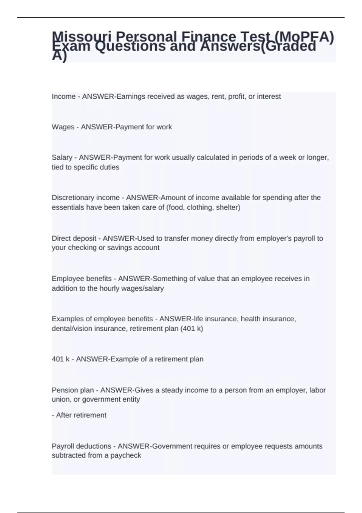 Missouri Personal Finance Test (MoPFA) Exam Questions and Answers(Graded A)
