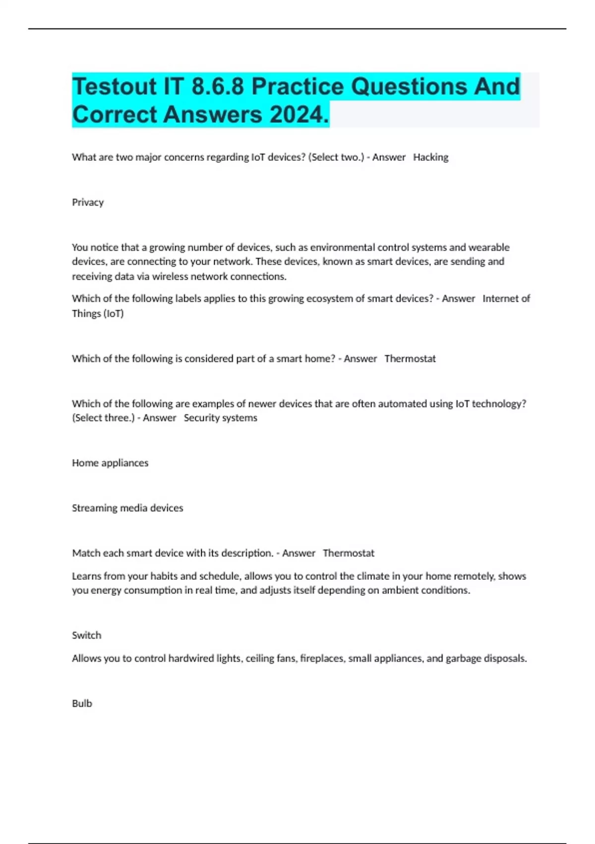 What are two major concerns regarding IoT devices? (Select two.) - Answer Hacking Privacy You notice that a growing number of devices, such as environmental control systems and wearable devices, are connecting to your network. These devices, known as smart devices, are sending and receiving data via wireless network connections. Which of the following labels applies to this growing ecosystem of smart devices? - Answer Internet of Things (IoT) Which of the following is considered part of a smart home? - Answer Thermostat Which of the following are examples of newer devices that are often automated using IoT technology? (Select three.) - Answer Security systems Home appliances Streaming media devices Match each smart device with its description. - Answer Thermostat Learns from your habits and schedule, allows you to control the climate in your home remotely, shows you energy consumption in real time, and adjusts itself depending on ambient conditions. Switch Allows you to control hardwired lights, ceiling fans, fireplaces, small appliances, and garbage disposals. Bulb
