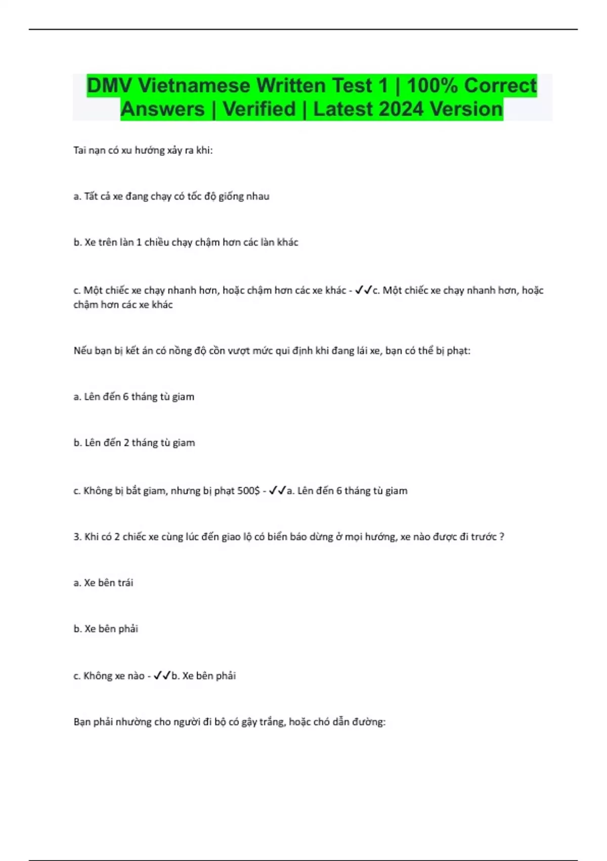 DMV Vietnamese Written Test 1 | 100% Correct Answers | Verified | Latest 2024 Version Tai nạn có xu hướng xảy ra khi: a. Tất cả xe đang chạy có tốc độ giống nhau b. Xe trên làn 1 chiều chạy chậm hơn các làn khác c. Một chiếc xe chạy nhanh hơn, hoặc chậm hơn các xe khác - c. Một chiếc xe chạy nhanh hơn, hoặc chậm hơn các xe khác Nếu bạn bị kết án có nồng độ cồn vượt mức qui định khi đang lái xe, bạn có thể bị phạt: a. Lên đến 6 tháng tù giam b. Lên đến 2 tháng tù giam c. Không bị bắt giam, nhưng bị phạt 500$ - a. Lên đến 6 tháng tù giam 3. Khi có 2 chiếc xe cùng lúc đến giao lộ có biển báo dừng ở mọi hướng, xe nào được đi trước ? a. Xe bên trái b. Xe bên phải c. Không xe nào - b. Xe bên phải Bạn phải nhường cho người đi bộ có gậy trắng, hoặc chó dẫn đường: a. Chỉ khi chó dẫn đường đang dẫn người đi bộ b. Chỉ khi người đi bộ tuân thủ đèn giao thông c. Bất cứ lúc nào - c. Bất cứ lúc nào Có 2 làn xe ở mỗi chiều. Bạn đang lái ở làn bên trái và có rất nhiều xe vượt bạn ở bên phải. Nếu tài xế sau xe bạn muốn lái nhanh hơn, bạn nên: a. Tiếp tục giữ làn để không cản trở lưu thông b. Lái vào lề bên trái để xe khác vượt bạn c. Di chuyển xe qua làn bên phải khi an toàn - c. Di chuyển xe qua làn bên phải khi an toàn Bạn đang có ý định vượt xe khác, bạn nên: a. Giả sử họ không chừa chỗ để cho bạn quay trở lại làn cũ b. Giả sử họ cho bạn vượt nếu bạn sử dụng xi nhan c. Giả sử họ vẫn tiếp tục duy trì tốc độ hiện tại - a. Giả sử họ không chừa chỗ để cho bạn quay trở lại làn cũ Bạn phải quan sát người lái mô tô đi chung làn bởi vì họ: a. Phải lái đối mặt với xe cộ đang đi tới b. Bất hợp pháp khi chia sẻ làn với mô tô c. Có quyền chia sẻ đường với bạn - c. Có quyền chia sẻ đường với bạn Bật cần gạt kính chắn gió và sử dụng đèn xe vào ngày mưa, tuyết, hoặc sương mù: a. Sử dụng đèn pha b. Để tài xế khác thấy bạn c. Chỉ khi lái xe trên cao tốc - b. Để tài xế khác thấy bạn Điều nào sau đúng được xe là lái xe thận trọng: a. Luôn phát hiện để ý những tai nạn có thể