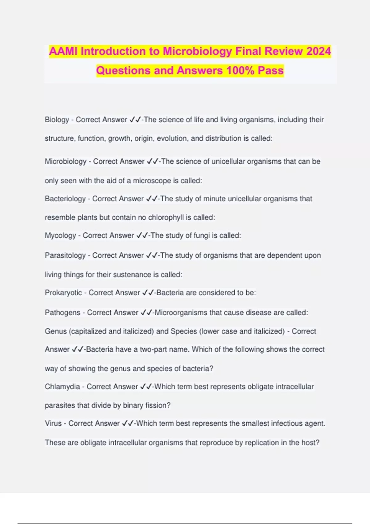 AAMI Introduction to Microbiology Final Review 2024 Questions and Answers 100% Pass Biology - Correct Answer ️️ -The science of life and living organisms, including their structure, function, growth, origin, evolution, and distribution is called: Microbiology - Correct Answer ️️ -The science of unicellular organisms that can be only seen with the aid of a microscope is called: Bacteriology - Correct Answer ️️ -The study of minute unicellular organisms that resemble plants but contain no chlorophyll is called: Mycology - Correct Answer ️️ -The study of fungi is called: Parasitology - Correct Answer ️️ -The study of organisms that are dependent upon living things for their sustenance is called: Prokaryotic - Correct Answer ️️ -Bacteria are considered to be: Pathogens - Correct Answer ️️ -Microorganisms that cause disease are called: Genus (capitalized and italicized) and Species (lower case and italicized) - Correct Answer ️️ -Bacteria have a two-part name. Which of the following shows the correct way of showing the genus and species of bacteria? Chlamydia - Correct Answer ️️ -Which term best represents obligate intracellular parasites that divide by binary fission? Virus - Correct Answer ️️ -Which term best represents the smallest infectious agent. These are obligate intracellular organisms that reproduce by replication in the host? Fungi - Correct Answer ️️ -Which term best represents plant-like structures that lack chlorophyll and cannot carry on photosynthesis or produce their own food? Prion - Correct Answer ️️ -Which term best represents microscopic protein particles that are similar to a virus and called slow acting? Fungi - Correct Answer ️️ -Yeasts and molds are examples of these organisms: Mycoplasma - Correct Answer ️️ -Penicillin is ineffective against these organisms. They are similar than ordinary bacteria and about the size of large viruses. Rickettsia - Correct Answer ️️ -These organisms are transmitted to man by insects who are the natural and primary host. Unicellular - Correct Answer ️️ -Living organisms that are composed of a single cell are said to be: Genus - Correct Answer ️️ -In the name Mycobacterium tuberculosis, the first name is the: False - Correct Answer ️️ -True/False Protozoa are morphologically unicellular organisms and are considered the lowest form of plant life. True - Correct Answer ️️ -True/False Molds and yeasts are forms of eukaryotes. False - Correct Answer ️️ -True/False All bacteria contain an organized nucleus. Cocci - Correct Answer ️️ -Bacteria that are spherical in shape are called: Round Shaped - Correct Answer ️️ -Bacteria that are spherical in shape are: Bacilli - Correct Answer ️️ -Rod-shaped bacteria are called