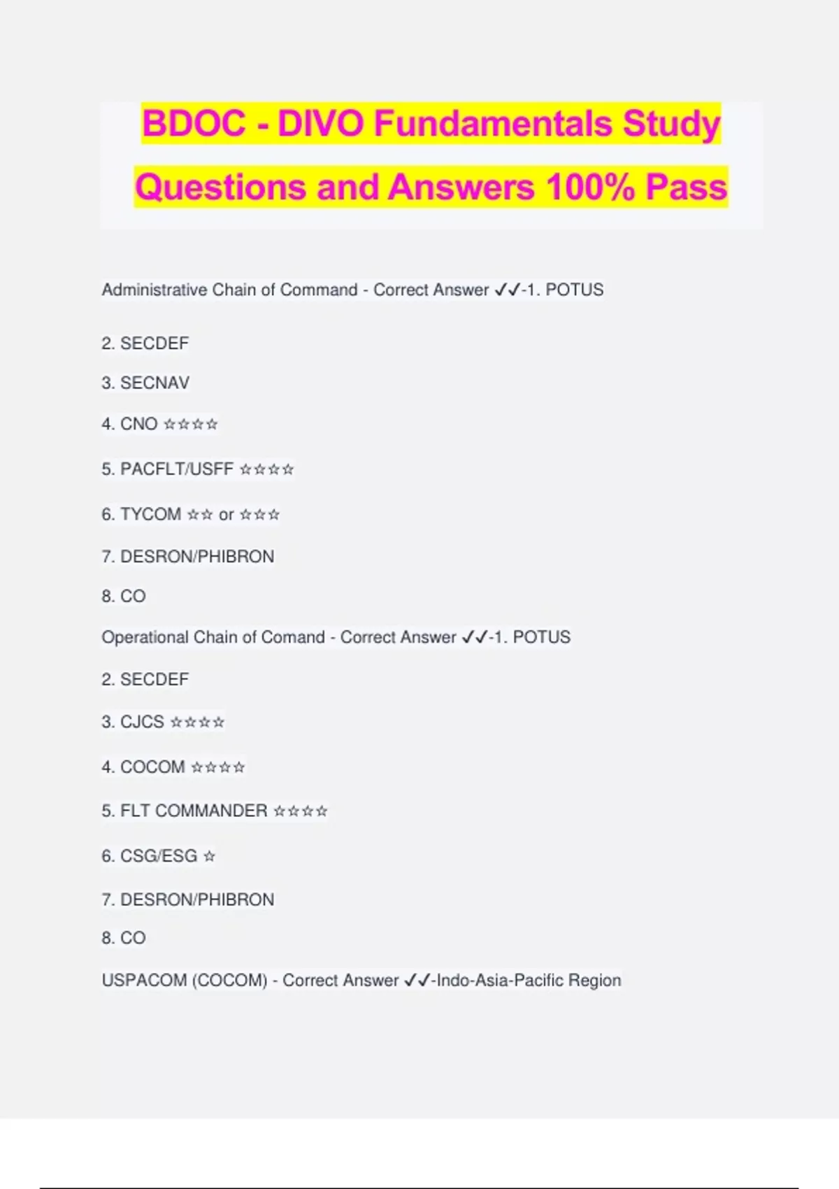 BDOC - DIVO Fundamentals Study Questions and Answers 100% Pass Administrative Chain of Command - Correct Answer ️️ -1. POTUS 2. SECDEF 3. SECNAV 4. CNO ☆☆☆☆ 5. PACFLT/USFF ☆☆☆☆ 6. TYCOM ☆☆ or ☆☆☆ 7. DESRON/PHIBRON 8. CO Operational Chain of Comand - Correct Answer ️️ -1. POTUS 2. SECDEF 3. CJCS ☆☆☆☆ 4. COCOM ☆☆☆☆ 5. FLT COMMANDER ☆☆☆☆ 6. CSG/ESG ☆ 7. DESRON/PHIBRON 8. CO USPACOM (COCOM) - Correct Answer ️️ -Indo-Asia-Pacific Region Based in Honolulu, HI USCENTCOM (COCOM) - Correct Answer ️️ -Middle East, Central Asia, Egypt Based in Macdill AFB, FL USAFRICOM (COCOM) - Correct Answer ️️ -Africa, except Egypt Based in Kelley Barracks, Germany USEUCOM (COCOM) - Correct Answer ️️ -Europe, Russia, Greenland, Israel Based in Stuttgart, Germany USNORTHCOM (COCOM) - Correct Answer ️️ -US, Alaska, Puerto Rico, Canada, Mexico Based in Peterson AFB, CO USSOUTHCOM (COCOM) - Correct Answer ️️ -Central and South America, Caribbean Based in Miami, FL SOCOM (COCOM) - Correct Answer ️️ -Special Operations Command -Training special forces -Based in Macdill AFB, FL STRATCOM (COCOM) - Correct Answer ️️ -Strategic Command -Global strike/mission defense/formerly cyber as well -Based in Omaha, NE TRANSCOM (COCOM) - Correct Answer ️️ -Transportation Command -Provide transportation and logistics in support of DoD assets -Based in Scott AFB, IL USFF (TF 80) - Correct Answer ️️ -West Atlantic 4th FLT - Correct Answer ️️ -Caribbean, Central, South America 3rd FLT - Correct Answer ️️ -East Pacific 7th FLT - Correct Answer ️️ -West Pacific, Indian Ocean 5th FLT - Correct Answer ️️ -Arabian Gulf, Red Sea, Gulf of Oman, part of Indian Ocean 6th FLT - Correct Answer ️️ -East Atlantic, Mediterranean, North Se