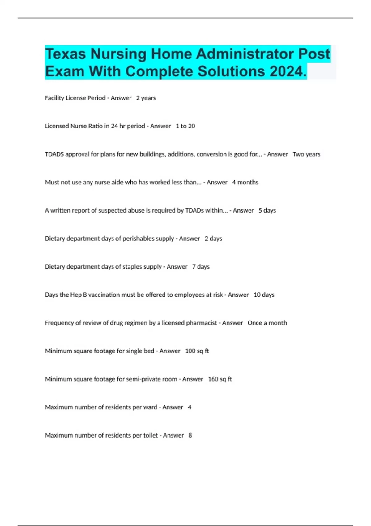 Texas Nursing Home Administrator Post Exam With Complete Solutions 2024.
