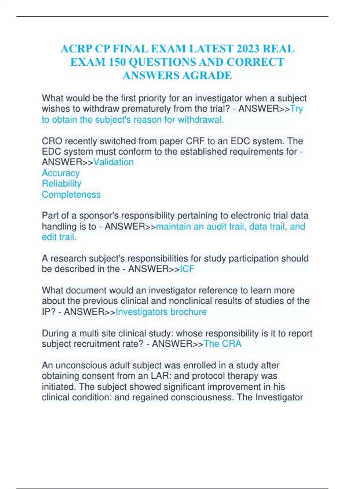 ACRP CP FINAL EXAM LATEST 2023 REAL EXAM 150 QUESTIONS AND CORRECT ANSWERS AGRADE