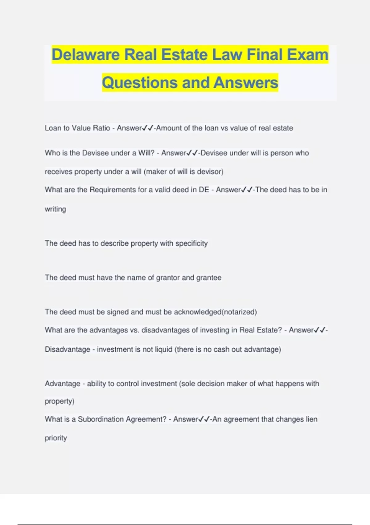 Delaware Real Estate Law Final Exam Questions and Answers Loan to Value Ratio - Answer️️ -Amount of the loan vs value of real estate Who is the Devisee under a Will? - Answer️️ -Devisee under will is person who receives property under a will (maker of will is devisor) What are the Requirements for a valid deed in DE - Answer️️ -The deed has to be in writing The deed has to describe property with specificity The deed must have the name of grantor and grantee The deed must be signed and must be acknowledged(notarized) What are the advantages vs. disadvantages of investing in Real Estate? - Answer️️ - Disadvantage - investment is not liquid (there is no cash out advantage) Advantage - ability to control investment (sole decision maker of what happens with property) What is a Subordination Agreement? - Answer️️ -An agreement that changes lien priority Who gets the money left over after a mortgage foreclosure sale? - Answer️️ -The person who took out the loan is entitled to remaining balance if property sale amount exceeds existing mortgage owed What is equity in a property? - Answer️️ -the difference between amount of debt on the property and the value of the property What title does the buyer have when the buyer and seller have a fully signed agreement of sale? - Answer️️ -equitable title What does rescind mean? - Answer️️ -It means to cancel (rescinded offer = cancelled offer) What is an Executory contract - Answer️️ -A contract that has a number of conditions that have to be satisfied - you don't have a fully executed contract until all conditions are fulfilled What is Power of Attorney? - Answer️️ -One person designates another person to represent and sign documents on their behalf Who signs the deed? - Answer️️ -Only the Grantor(seller) signs the deed What is joint Tenancy? - Answer️️ -(has the right of survivorship) If 2 people own property and one dies, other owner automatically gets ownership interest of the dead person Both people own 100% of property (no fractional control) - 1 joint tenant can sell or lien their interest without the consent of the other person What is Tenancy by the Entirety? - Answer️️ -(has right of survivorship) Husband and Wife one spouse CANNOT sell or lien without the consent of their partner What are the continuing education requirements for Real Estate Agents in DE? - Answer️️ -21 hours biannually (every 2 years - 12 must be completed in first year of license) must be completed by April 30th What is Leverage? - Answer️️ -Using others money to acquire real estate -if property is 100k and you borrow 100k you are 100% leveraged - The higher the leverage the riskier the loan is What are the elements of a valid real estate contract? - Answer️️ -A valid contract must: Be a voluntary agreement between two competent parties Be supported by consideration to perform some legal act (consideration = compensation) What is an Encumbrance? - Answer️️ -Any right of a third party over your property (judgement, deed restriction, mortgage) What is the lien priority of unpaid real estate taxes? - Answer️️ -- Real estate taxes are always first in terms of lien priority - Real estate taxes are super priority lien- How is commission on a real estate transaction determined? - Answer️️ -Commission is determined by a negotiation between broker and client What is Lien theory vs. Title theory, as it relates to mortgages? - Answer️️ -Delaware records mortgage as lien against property -DE is a lien theory state - Title theory is a deed of trust, where the lender owns the property. You have right of possession until you pay back loan, at which time the bank conveys the property back with a trustee deed How are taxes prorated on a settlement sheet? (credit v. debit) - Answer️