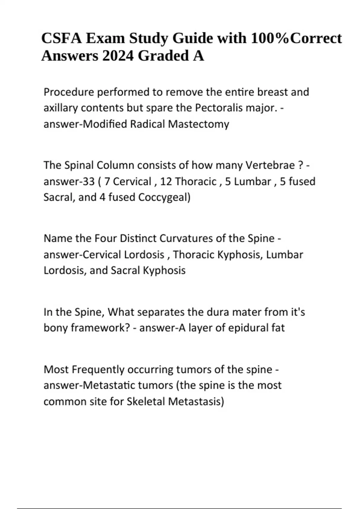 CSFA Exam Study Guide with 100%Correct Answers 2024 Graded A. Procedure performed to remove the entire breast and axillary contents but spare the Pectoralis major. - answer-Modified Radical Mastectomy The Spinal Column consists of how many Vertebrae ? - answer-33 ( 7 Cervical , 12 Thoracic , 5 Lumbar , 5 fused Sacral, and 4 fused Coccygeal) Name the Four Distinct Curvatures of the Spine - answer-Cervical Lordosis , Thoracic Kyphosis, Lumbar Lordosis, and Sacral Kyphosis In the Spine, What separates the dura mater from it's bony framework? - answer-A layer of epidural fat Most Frequently occurring tumors of the spine - answer-Metastatic tumors (the spine is the most common site for Skeletal Metastasis) CSFA Exam Study Guide with 100%Correct Answers 2024 Graded A (!!!) Newborn Vomiting, free of bile, and projectile in nature is indicative of what diagnosis ? - answer-Pyloric Stenosis Neurological Disorder, characterized by excruciating , "piercing" pain in the face is indicative of what diagnosis ? - answer-Trigeminal Neuralgia Neurotransmitter/Hormone that mediates impulse transmission at most Post-ganglionic Sympathetic Nerve endings - answer-Norepinephrine (noradrenaline) Neurotransmitter at all parasympathetic and preganglionic sympathetic neurons - answer-Acetylcholine The Right subclavian artery is a branch of what preceding Vessel ? - answer-The Brachiocephalic trunk (aka The innominate Artery) The wall of the heart consists of how many layers ? - answer-3 ( epicardium or pericardium, myocardium , endocardium) The vein that drains the Right Side of the Vertebral column - answer-The Azygos Vein Device used to siphon off excess CSF into the abdomen thereby decreasing intracranial pressure - answerVP(vetriculo-peritoneal) shunt Veins that drain the intracranial sinuses to veins outside of the skull - answer-Emissary Veins Disorder characterized by a compression of the Abductor Pollicis Longus and Extensor Pollicis Brevis Tendons near the radial styloid process - answer-De Quervain's Tenosynovitis Following an injury to the lower limb, the patients lower leg can easily be displaced anteriorly on a fixed thigh, this is indicative of injury to what structure? - answer-ACL (anterior cruciate ligament) tear Most frequently injured tendon of the rotator cuff - answer-The supraspinatus (aka supraspinous) tendon Typical Potassium levels - answer-3.5 - 5.5 mEq/L ( you buy bananas in bunches of 3 - 5)(lab value ranges can vary from lab to lab) Typical blood PH - answer-7.35 - 7.45 (lab value ranges can vary from lab to lab).