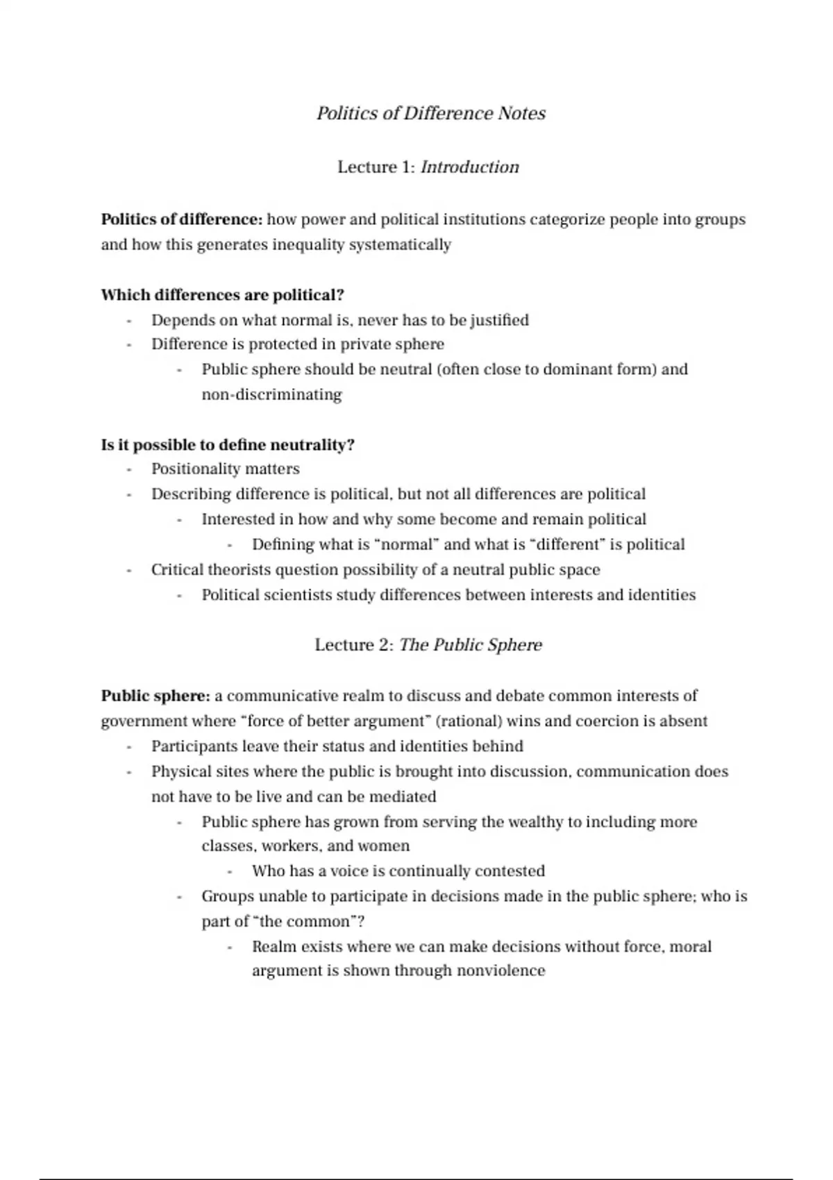 My Politics of Difference final exam study guide. I used these notes to get a 7.9 on the exam just by reading and re-reading them. Honestly, the exam is pretty easy if you just take in the information on the study guide. It had all the information I needed. The study guide is detailed enough to have all the relevant material from the course but short enough for you to memorize and retain what is important from the exam. Complete with... - lecture notes, written on paper in lectures and later typed in the doc - short summaries of the readings coordinated with what lecture they relate to - important people that were discussed in the lectures Disclaimer: lecture 5 is missing! Sorry about that, but in my case, it didn't matter, and I did really well without it. Lecture 1: Introduction Lecture 2: The Public Sphere - Bennet & Livingston - Young Lecture 3: Religion - Habermas - Taylor - Mahmood Lecture 4: The State System - Malikki - Scott Lecture 6: Material Inequality - Scholz - Piketty Lecture 7: Race & Coloniality - Quijano - Said - Wekker - Hall Lecture 8: Identity - Appiah - Polletta and Jasper Lecture 9: Gender and Sexuality - Hanish - Pateman - MacKinnon - Okin - Hooks - Rich - Connell - Celis Lecture 10: Descriptive Representation - Pitkin - Phillips - Aydemir & Vliegenthart Lecture 11: Disability - Aciksoz