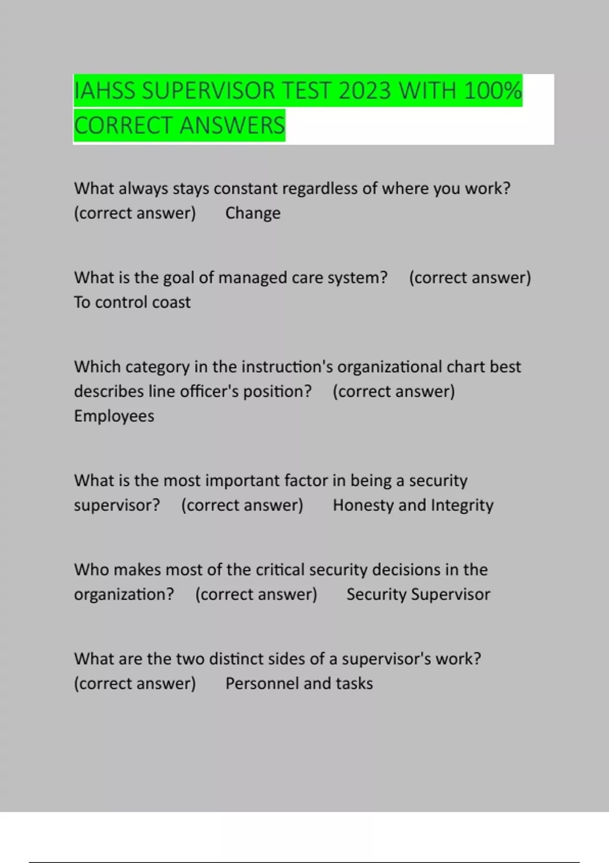IAHSS SUPERVISOR TEST 2024 WITH 100% CORRECT ANSWERS
