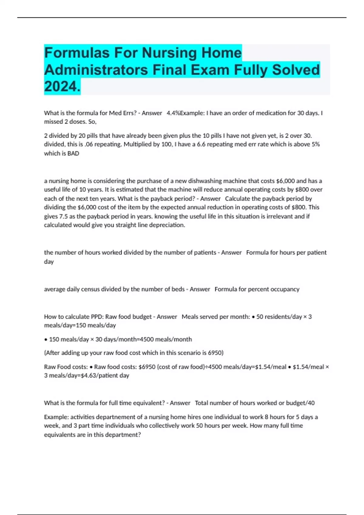 What is the formula for Med Errs? - Answer 4.4%Example: I have an order of medication for 30 days. I missed 2 doses. So, 2 divided by 20 pills that have already been given plus the 10 pills I have not given yet, is 2 over 30. divided, this is .06 repeating. Multiplied by 100, I have a 6.6 repeating med err rate which is above 5% which is BAD a nursing home is considering the purchase of a new dishwashing machine that costs $6,000 and has a useful life of 10 years. It is estimated that the machine will reduce annual operating costs by $800 over each of the next ten years. What is the payback period? - Answer Calculate the payback period by dividing the $6,000 cost of the item by the expected annual reduction in operating costs of $800. This gives 7.5 as the payback period in years. knowing the useful life in this situation is irrelevant and if calculated would give you straight line depreciation. the number of hours worked divided by the number of patients - Answer Formula for hours per patient day average daily census divided by the number of beds - Answer Formula for percent occupancy How to calculate PPD: Raw food budget - Answer Meals served per month: • 50 residents/day × 3 meals/day=150 meals/day • 150 meals/day × 30 days/month=4500 meals/month (After adding up your raw food cost which in this scenario is 6950) Raw Food costs: • Raw food costs: $6950 (cost of raw food)÷4500 meals/day=$1.54/meal • $1.54/meal × 3 meals/day=$4.63/patient day What is the formula for full time equivalent? - Answer Total number of hours worked or budget/40 Example: activities departnement of a nursing home hires one individual to work 8 hours for 5 days a week, and 3 part time individuals who collectively work 50 hours per week. How many full time equivalents are in this department?