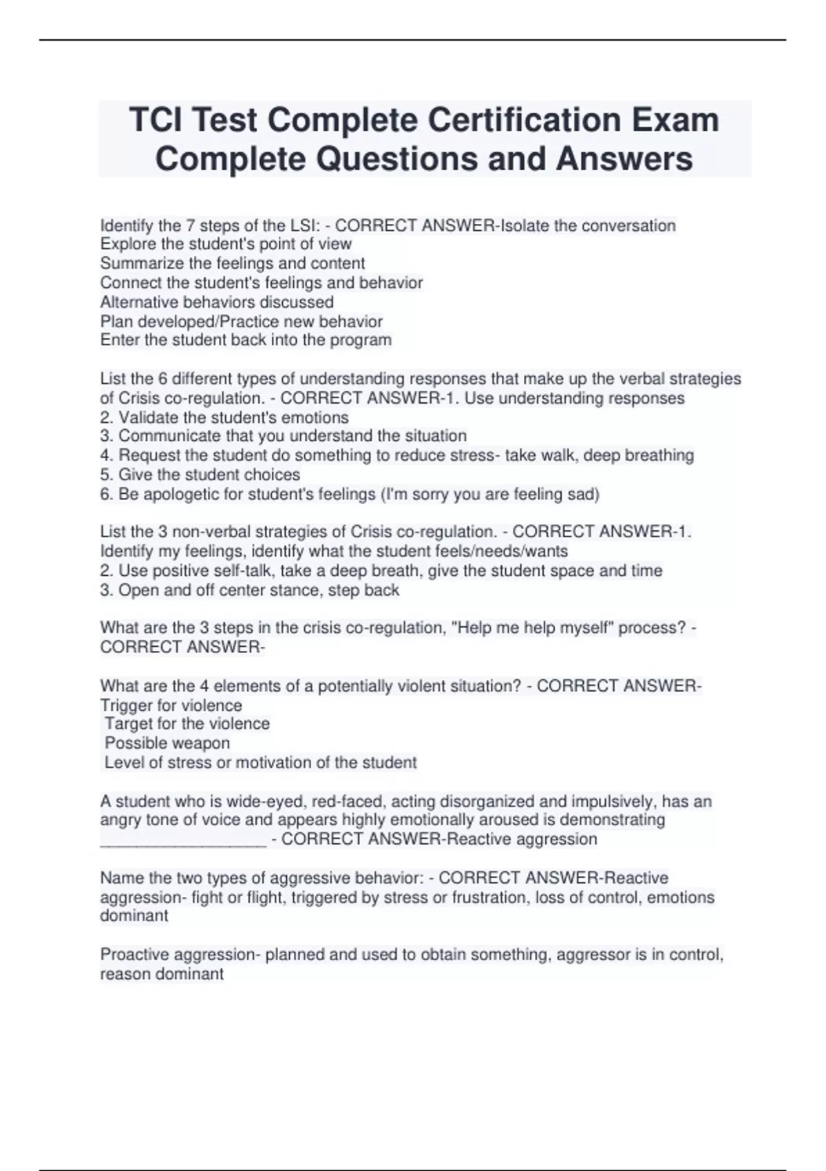 TCI Test Complete Certification Exam Complete Questions and Answers Identify the 7 steps of the LSI: - CORRECT ANSWER-Isolate the conversation Explore the student's point of view Summarize the feelings and content Connect the student's feelings and behavior Alternative behaviors discussed Plan developed/Practice new behavior Enter the student back into the program List the 6 different types of understanding responses that make up the verbal strategies of Crisis co-regulation. - CORRECT ANSWER-1. Use understanding responses 2. Validate the student's emotions 3. Communicate that you understand the situation 4. Request the student do something to reduce stress- take walk, deep breathing 5. Give the student choices 6. Be apologetic for student's feelings (I'm sorry you are feeling sad) List the 3 non-verbal strategies of Crisis co-regulation. - CORRECT ANSWER-1. Identify my feelings, identify what the student feels/needs/wants 2. Use positive self-talk, take a deep breath, give the student space and time 3. Open and off center stance, step back What are the 3 steps in the crisis co-regulation, "Help me help myself" process? - CORRECT ANSWERWhat are the 4 elements of a potentially violent situation? - CORRECT ANSWERTrigger for violence Target for the violence Possible weapon Level of stress or motivation of the student A student who is wide-eyed, red-faced, acting disorganized and impulsively, has an angry tone of voice and appears highly emotionally aroused is demonstrating __________________ - CORRECT ANSWER-Reactive aggression Name the two types of aggressive behavior: - CORRECT ANSWER-Reactive aggression- fight or flight, triggered by stress or frustration, loss of control, emotions dominant Proactive aggression- pla