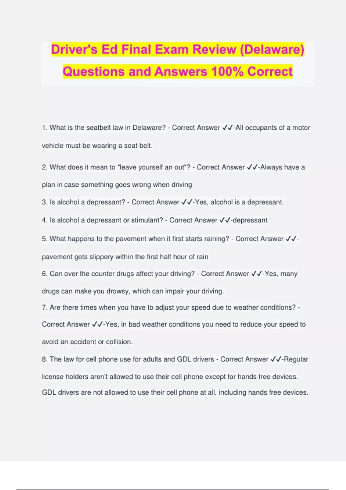 Driver's Ed Final Exam Review (Delaware) Questions and Answers 100% Correct 1. What is the seatbelt law in Delaware? - Correct Answer ️️ -All occupants of a motor vehicle must be wearing a seat belt. 2. What does it mean to "leave yourself an out"? - Correct Answer ️️ -Always have a plan in case something goes wrong when driving 3. Is alcohol a depressant? - Correct Answer ️️ -Yes, alcohol is a depressant. 4. Is alcohol a depressant or stimulant? - Correct Answer ️️ -depressant 5. What happens to the pavement when it first starts raining? - Correct Answer ️️ - pavement gets slippery within the first half hour of rain 6. Can over the counter drugs affect your driving? - Correct Answer ️️ -Yes, many drugs can make you drowsy, which can impair your driving. 7. Are there times when you have to adjust your speed due to weather conditions? - Correct Answer ️️ -Yes, in bad weather conditions you need to reduce your speed to avoid an accident or collision. 8. The law for cell phone use for adults and GDL drivers - Correct Answer ️️ -Regular license holders aren't allowed to use their cell phone except for hands free devices. GDL drivers are not allowed to use their cell phone at all, including hands free devices. 9. What do solid yellow lines mean? - Correct Answer ️️ -Passing is not allowed and the traffic is moving in different directions 10. Which way should pedestrians face when there is no available sidewalk? - Correct Answer ️️ -walk on the side where you will be facing oncoming traffic 11. What are the rules for logging practice hours on the first 6 months of your GDL? - Correct Answer ️️ -50 hours of driving practice, 10 hours is night driving; turned into Dpt. of Education certified by sponsor 12. Right Turns on Red - Correct Answer ️️ -Right turns on red are allowed if not otherwise made illegal by signage 13. Which behaviors will constitute "aggressive driving? - Correct Answer ️️ -failure to yield, unsafe lane changes, disregard of a traffic control device, failure to stop at the command of a police officer, following too closely, passing on the shoulder, and speeding 14. Zero Tolerance Law - Correct Answer ️️ -People under the age of 21 who are driving while consuming or after having consumed alcoholic beverages, shall have his/her driver license revoked for two months for the first offense and not less than six months nor more than twelve months for each subsequent offense 15. What should you do when approached by an emergency vehicle with flashing lights? - Correct Answer ️️ -Pull over to the right if possible, but more importantly, get out of the way 16. At the scene of an accident should you move an injured passenger? - Correct Answer ️️ -No, never move an injured person at an accident unless they are in danger of getting hit by passing cars or they are in a burning car 17. Can wind cause your car to sway on the road? - Correct Answer ️️ -Yes, wind can cause your car to sway so you need to hold onto the steering wheel to prevent swerving. 18. Why do you give motorcycles more room? - Correct Answer ️️ -Motorcycles have two wheels so they stop faster than cars and they are smaller so it is harder to judge distance. 19. Green signal - Correct Answer ️️ -Proceed w/ caution Yellow signal - Correct Answer ️️ -Prepare to stop, if too close to stop, proceed w/ caution Red signal - Correct Answer ️️ -Come to a complete stop, right turns on red are permitted if there is no signage saying otherwise, and left turns on red from a one-way street to another one-way street are permitted if there is no signage saying otherwise Rules and restrictions of first 6 months of GDL - Correct Answer ️️ -Must have permit in possession when driving, only passengers are adult supervisor and one other passenger, adult supervisor must be in car at all times when driving Rules and restrictions of second 6 months of GDL - Correct Answer ️️ -May drive unsupervised between 6:00 am and 10:00 pm, can drive outside of those times when going to and from home and work activities, school activities on school property, or religious activities; can drive between 10 pm and 6 am with supervisor, when supervisor isn't present, only one other passenger 21. When you back up or reverse which way should you turn the wheel? - Correct Answer ️️ -Turn the wheel in the direction you want to go. 22. Should you enter an intersection if you can't clear it? - Cor