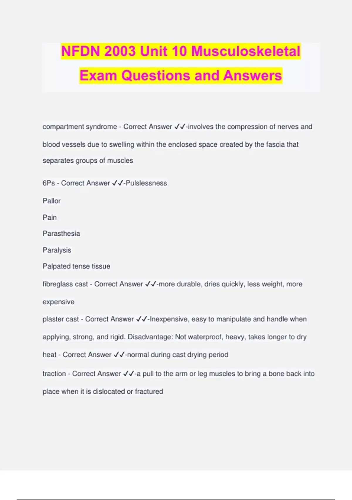 NFDN 2003 Unit 10 Musculoskeletal Exam Questions and Answers compartment syndrome - Correct Answer ️️ -involves the compression of nerves and blood vessels due to swelling within the enclosed space created by the fascia that separates groups of muscles 6Ps - Correct Answer ️️ -Pulslessness Pallor Pain Parasthesia Paralysis Palpated tense tissue fibreglass cast - Correct Answer ️️ -more durable, dries quickly, less weight, more expensive plaster cast - Correct Answer ️️ -Inexpensive, easy to manipulate and handle when applying, strong, and rigid. Disadvantage: Not waterproof, heavy, takes longer to dry heat - Correct Answer ️️ -normal during cast drying period traction - Correct Answer ️️ -a pull to the arm or leg muscles to bring a bone back into place when it is dislocated or fractured