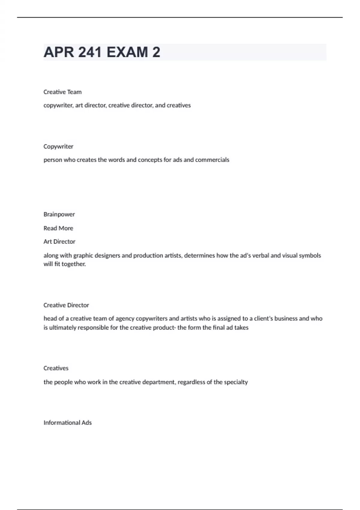 APR 241 EXAM 2Creative Team copywriter, art director, creative director, and creatives Copywriter person who creates the words and concepts for ads and commercials Brainpower Read More Art Director along with graphic designers and production artists, determines how the ad's verbal and visual symbols will fit together. Creative Director head of a creative team of agency copywriters and artists who is assigned to a client's business and who is ultimately responsible for the creative product- the form the final ad takes Creatives the people who work in the creative department, regardless of the specialty Informational Ads