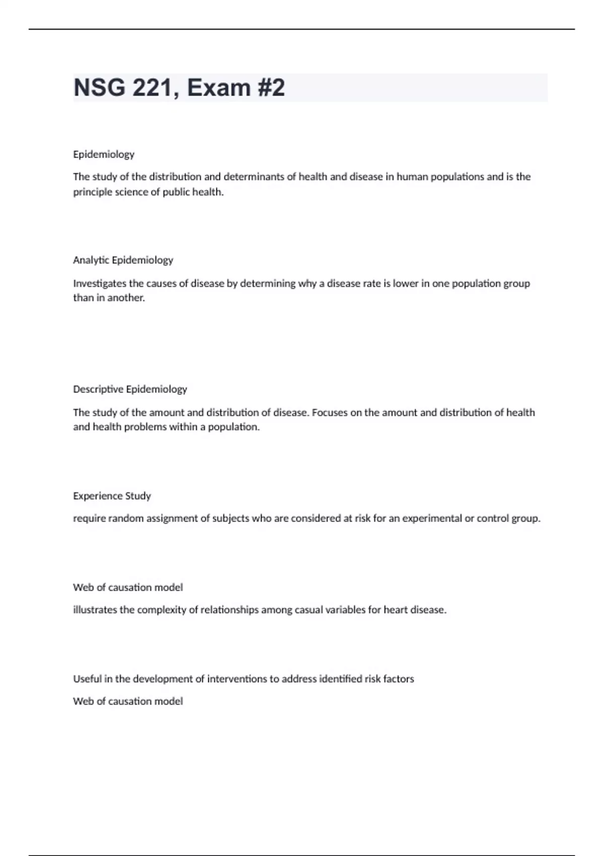 NSG 221, Exam #2Epidemiology The study of the distribution and determinants of health and disease in human populations and is the principle science of public health. Analytic Epidemiology Investigates the causes of disease by determining why a disease rate is lower in one population group than in another. Descriptive Epidemiology The study of the amount and distribution of disease. Focuses on the amount and distribution of health and health problems within a population. Experience Study require random assignment of subjects who are considered at risk for an experimental or control group. Web of causation model illustrates the complexity of relationships among casual variables for heart disease. Useful in the development of interventions to address identified risk factors Web of causation model