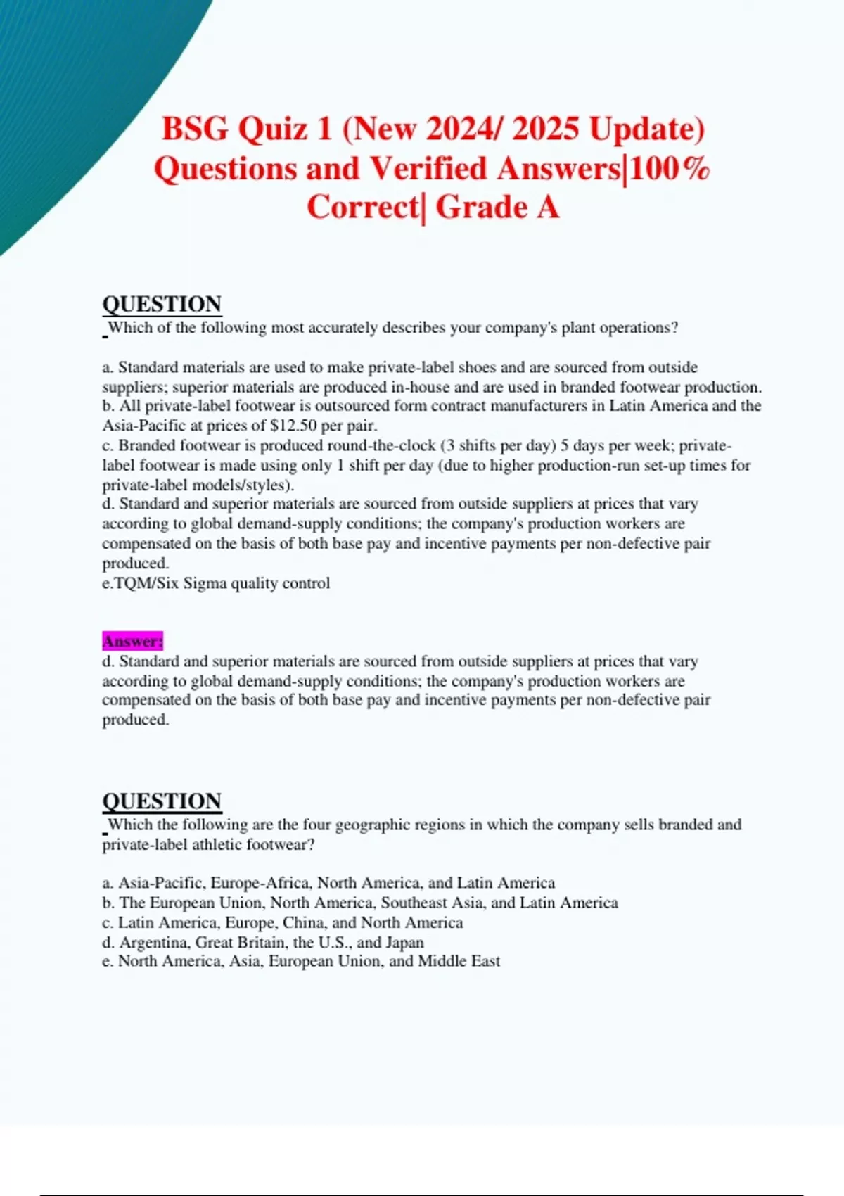 BSG Quiz 1 (New 2024/ 2025 Update) Questions and Verified Answers|100% Correct| Grade A QUESTION Which of the following most accurately describes your company's plant operations? a. Standard materials are used to make private-label shoes and are sourced from outside suppliers; superior materials are produced in-house and are used in branded footwear production. b. All private-label footwear is outsourced form contract manufacturers in Latin America and the Asia-Pacific at prices of $12.50 per pair. c. Branded footwear is produced round-the-clock (3 shifts per day) 5 days per week; privatelabel footwear is made using only 1 shift per day (due to higher production-run set-up times for private-label models/styles). d. Standard and superior materials are sourced from outside suppliers at prices that vary according to global demand-supply conditions; the company's production workers are compensated on the basis of both base pay and incentive payments per non-defective pair produced. e.TQM/Six Sigma quality control Answer: d. Standard and superior materials are sourced from outside suppliers at prices that vary according to global demand-supply conditions; the company's production workers are compensated on the basis of both base pay and incentive payments per non-defective pair produced. QUESTION Which the following are the four geographic regions in which the company sells branded and private-label athletic footwear? a. Asia-Pacific, Europe-Africa, North America, and Latin America b. The European Union, North America, Southeast Asia, and Latin America c. Latin America, Europe, China, and North America d. Argentina, Great Britain, the U.S., and Japan e. North America, Asia, European Union, and Middle East Answer: a. Asia-Pacific, Europe-Africa, North America, and Latin America QUESTION In Year 11, footwear companies can expect to sell a. an average of 4.84 million branded pairs and an average of