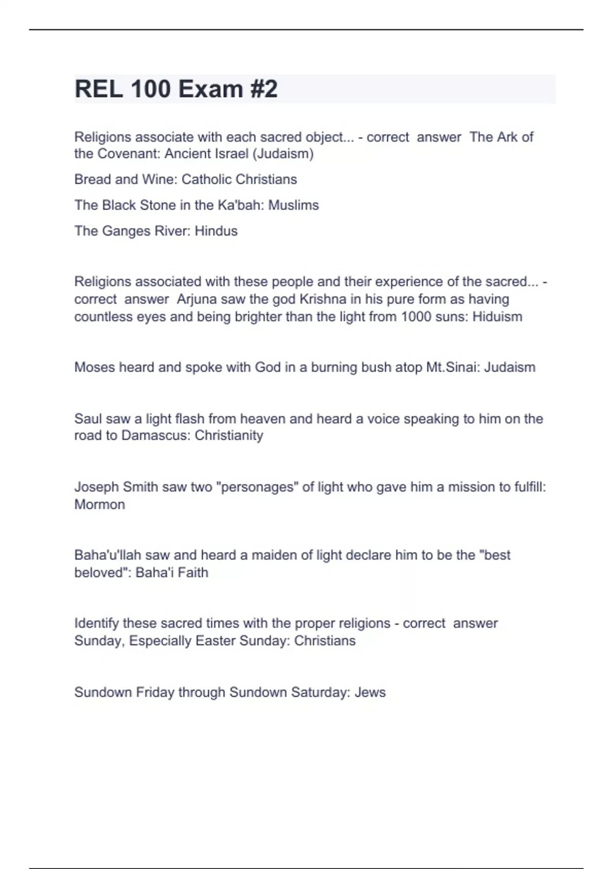 REL 100 Exam Question and answers already passed REL 100 Exam #2 Religions associate with each sacred object... - correct answer The Ark of the Covenant: Ancient Israel (Judaism) Bread and Wine: Catholic Christians The Black Stone in the Ka'bah: Muslims The Ganges River: Hindus Religions associated with these people and their experience of the sacred... - correct answer Arjuna saw the god Krishna in his pure form as having countless eyes and being brighter than the light from 1000 suns: Hiduism Moses heard and spoke with God in a burning bush atop Mt.Sinai: Judaism Saul saw a light flash from heaven and heard a voice speaking to him on the road to Damascus: Christianity Joseph Smith saw two "personages" of light who gave him a mission to fulfill: Mormon Baha'u'llah saw and heard a maiden of light declare him to be the "best beloved": Baha'i Faith Identify these sacred times with the proper religions - correct answer Sunday, Especially Eas