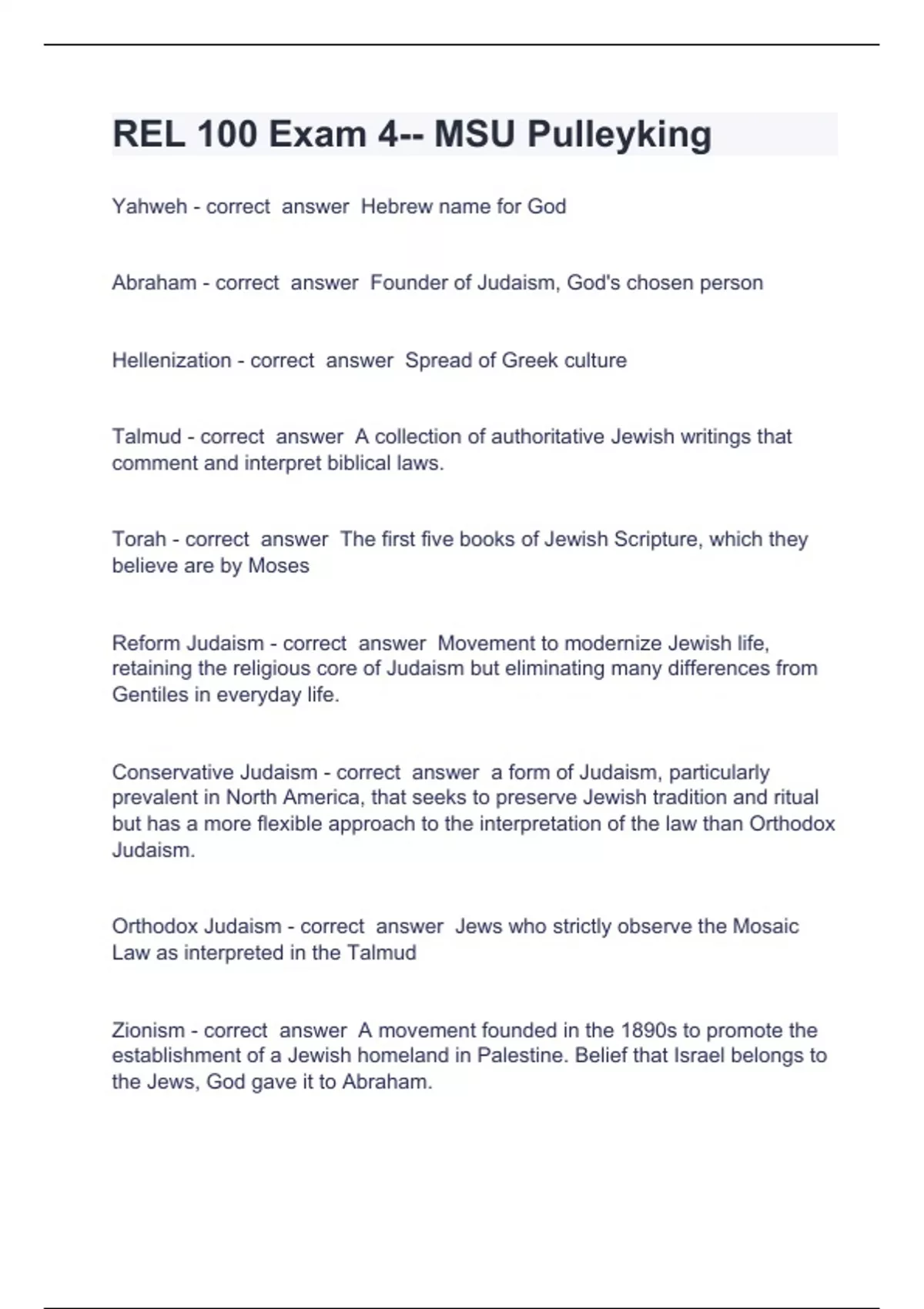 REL 100 Exam 4 Question and answers correctly solved REL 100 Exam 4-- MSU Pulleyking Yahweh - correct answer Hebrew name for God Abraham - correct answer Founder of Judaism, God's chosen person Hellenization - correct answer Spread of Greek culture Talmud - correct answer A collection of authoritative Jewish writings that comment and interpret biblical laws. Torah - correct answer The first five books of Jewish Scripture, which they believe are by Moses Reform Judaism - correct answer Movement to modernize Jewish life, retaining the religious core of Judaism but eliminating many differences from Gentiles in everyday life. Conservative Judaism - correct answer a form of Judaism, particularly prevalent in North America, that seeks to preserve Jewish tradition and ritual but has a more flexible approach to the interpretation of the law than Orthodox Judaism. Orthodox Judaism - correct answer Jews who strictly observe the Mosaic Law as interpreted in the Talmud Zionism - correct answer A movement founded in the 1890s to promote the establishment of a Jewish homeland in Palestine. Belief that Israel belongs to the Jews, God gave it t