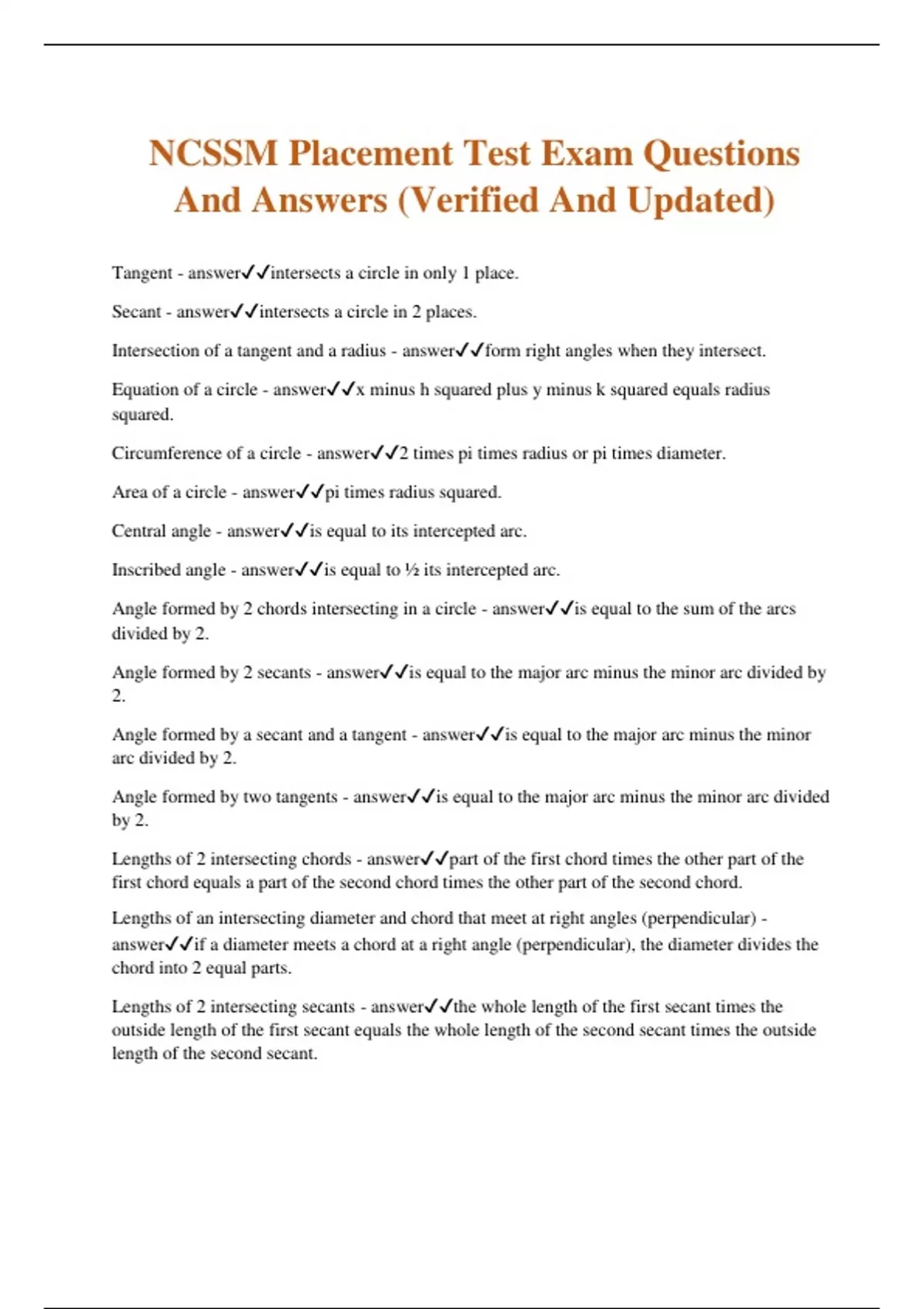 NCSSM Placement Test Exam Questions And Answers (Verified And Updated) Tangent - answerintersects a circle in only 1 place. Secant - answerintersects a circle in 2 places. Intersection of a tangent and a radius - answerform right angles when they intersect. Equation of a circle - answerx minus h squared plus y minus k squared equals radius squared. Circumference of a circle - answer2 times pi times radius or pi times diameter. Area of a circle - answerpi times radius squared. Central angle - answeris equal to its intercepted arc. Inscribed angle - answeris equal to ½ its intercepted arc. Angle formed by 2 chords intersecting in a circle - answeris equal to the sum of the arcs divided by 2. Angle formed by 2 secants - answeris equal to the major arc minus the minor arc divided by 2. Angle formed by a secant and a tangent - answeris equal to the major arc minus the minor arc divided by 2. Angle formed by two tangents - answeris equal to the major arc minus the minor arc divided by 2. Lengths of 2 intersecting chords - answerpart of the first chord times the other part of the first chord equals a part of the second chord times the other part of the second chord. Lengths of an intersecting diameter and chord that meet at right angles (perpendicular) - answerif a diameter meets a chord at a right angle (perpendicular), the diameter divides the chord into 2 equal parts. Lengths of 2 intersecting secants - answerthe whole length of the first secant times the outside length of the first secant equals the whole length of the second secant times the outside length of the second secant. Lengths of an instersecting secant and tangent - answerthe whole length of the first secant times the outside length of the first secant equals the length of the tangent squared. Lengths of intersecting tangents - answerTangents to a circle sharing a common vertex are equal. Angles - answeracute angles are less than 90 degrees. Right angles are 90 degrees. obtuse angles are between 90 and 180 degrees. Straight angles are 180 degrees and reflex angles are greater than 180 degrees. Adjacent angles - answershare a common vertex, a common side, but not common interior points. Complementary angles - answer2 angles when added together that equal 90 degrees. They do not have to be adjacent angles. Supplementary angles - answer2 angles when added together that equal 180 degrees.They do not have to be adjacent angles. Vertical angles - answervertical angles are congruent. Alternate interior angles - answeralternate interior angles are congruent. Corresponding angles - answercorresponding angles are congruent. Sum of the angles in a triangle - answerthe 3 angles of a triangle add up to 180 degrees. Triangles classified by sides - answerscalene triangles have no equal sides. isosceles triangles have at least 2 equal sides. equilateral triangles have 3 equal sides. Triangles classified by angles - answeracute triangles have 3 acute angles. right triangles have a 90 degree and 2 acute angles. obtuse triangles have an obtuse and 2 acute angles. Exterior angle of a triangle - answerthe exterior angle of a triangle equals the sum of the 2 opposite interior angles. Isosceles triangles - answersides opposite congruent angles are congruent. angles opposite congruent sides are congruent. Triangle inequality theorem - answerthe sum of 2 sides of a triangle must be greater than the 3rd side. Mid segment of a triangle - answera mid segment connects the midpoint of 2 sides of a triangle and is equal to ½ the side not containing the 2 midpoints. Median - answerbisects the opposite side into 2 congruent line segments. they meet in a triangle at a point called the centroid. median segments are in a ratio of 2 to 1. Angle bisector - answerbisects an angle into 2 congruent angles. they meet in a triangle at a point called the incenter. Altitude - answermakes a right angle with the opposite side. they meet in a triangle at a point called the orthocenter. Perpendicular bisector - answerbisects and makes a right angle with a side of a triangle.They meet in a triangle at a point called the circumcenter. Similar triangles - answerangles in similar (∼) triangles are congruent. sides are in proportion. angles are in a proportion of one to one. (1:1) Proving triangles similar - answerneed only 2 angles to be congruent to probe 2 triangles similar. Proving triangles congruent - answercan not be angle angle side (A.S.S.) or side side angle(S.S.A.). C.P.C.T.C. - answercorresponding parts of congruent triangles are congruent. Pythagorean theorem - answera squared plus b squared equals c squared. the hypotenuse is always c. Proving right triangles congruent - answerhypotenuse leg. Right triangle ratios - answer Slope - answerfrom left to right. up the hill is positive slope. down the hill is negative slope. a horizontal line has 0 slope and a verical line as an undefined slope. Point slope form of a line - answery minus y one equals slope (m) times x minus x one. Slope intercept form of a line - answery equals slope (m) times x plus the y intercept (b) Slope formula - answery two minus y one divided by x two minus x one.