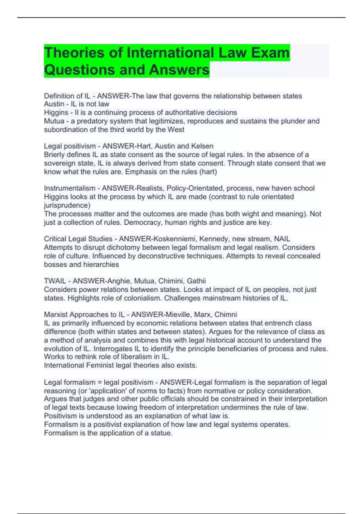 Definition of IL - ANSWER-The law that governs the relationship between states Austin - IL is not law Higgins - Il is a continuing process of authoritative decisions Mutua - a predatory system that legitimizes, reproduces and sustains the plunder and subordination of the third world by the West Legal positivism - ANSWER-Hart, Austin and Kelsen Brierly defines IL as state consent as the source of legal rules. In the absence of a sovereign state, IL is always derived from state consent. Through state consent that we know what the rules are. Emphasis on the rules (hart) Instrumentalism - ANSWER-Realists, Policy-Orientated, process, new haven school Higgins looks at the process by which IL are made (contrast to rule orientated jurisprudence) The processes matter and the outcomes are made (has both wight and meaning). Not just a collection of rules. Democracy, human rights and justice are key. Critical Legal Studies - ANSWER-Koskenniemi, Kennedy, new stream, NAIL Attempts to disrupt dichotomy between legal formalism and legal realism. Considers role of culture. Influenced by deconstructive techniques. Attempts to reveal concealed bosses and hierarchies TWAIL - ANSWER-Anghie, Mutua, Chimini, Gathii Considers power relations between states. Looks at impact of IL on peoples, not just states. Highlights role of colonialism. Challenges mainstream histories of IL. Marxist Approaches to IL - ANSWER-Mieville, Marx, Chimni IL as primarily influenced by economic relations between states that entrench class difference (both within states and between states). Argues for the relevance of class as a method of analysis and combines this with legal historical account to understand the evolution of IL. Interrogates IL to identify the principle beneficiaries of process and rules. Works to rethink role of liberalism in IL. International Feminist legal theories also exists. Legal formalism = legal positivism - ANSWER-Legal formalism is the separation of legal reasoning (or 'application' of norms to facts) from normative or policy consideration. Argues that judges and other public officials should be constrained in their interpretation of legal texts because lowing freedom of interpretation undermines the rule of law. Positivism is understood as an explanation of what law is. Formalism is a positivist explanation of how law and legal systems operates. Formalism is the application of a statue.