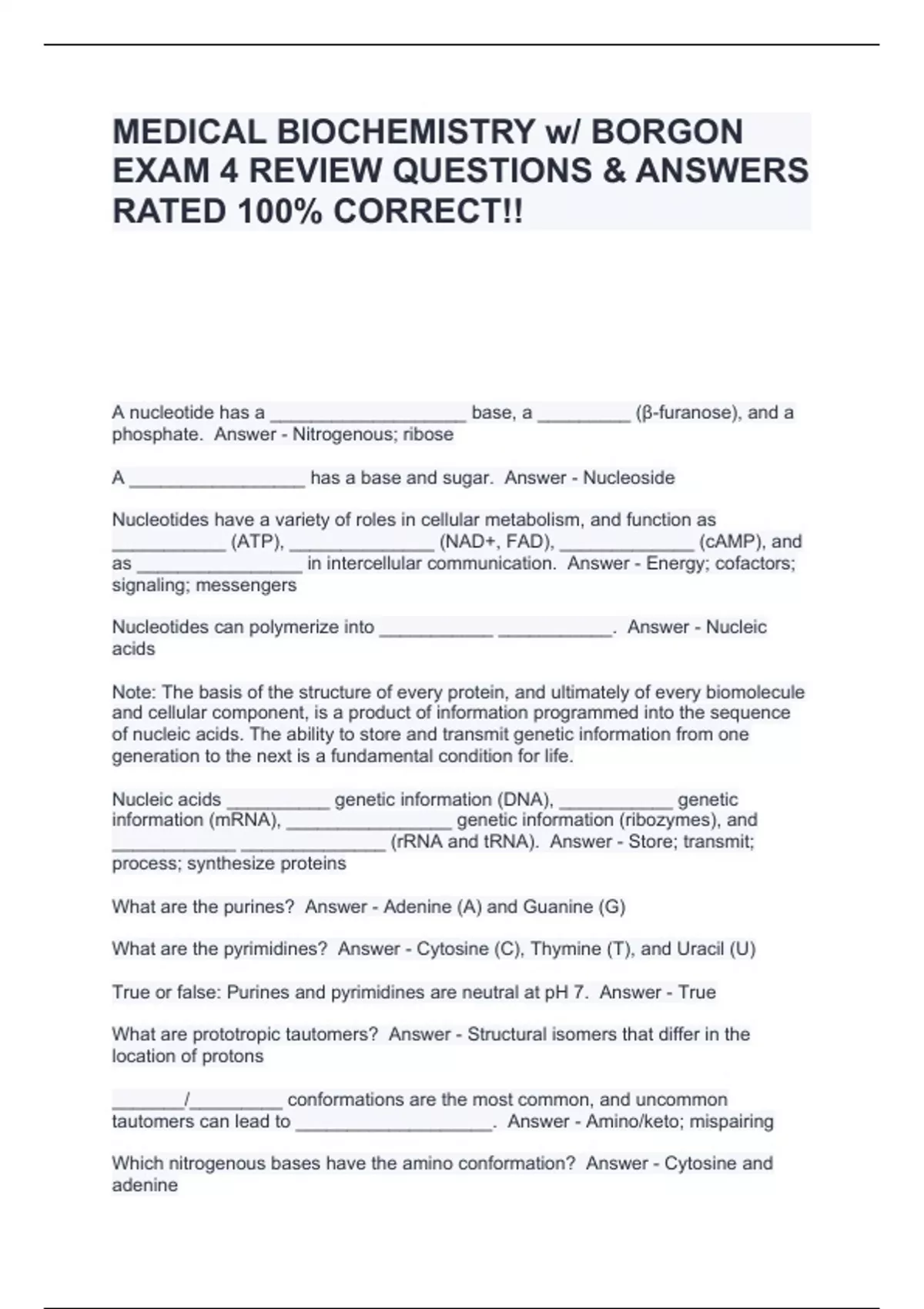 MEDICAL BIOCHEMISTRY w/ BORGON EXAM 4 REVIEW QUESTIONS & ANSWERS RATED 100% CORRECT!!