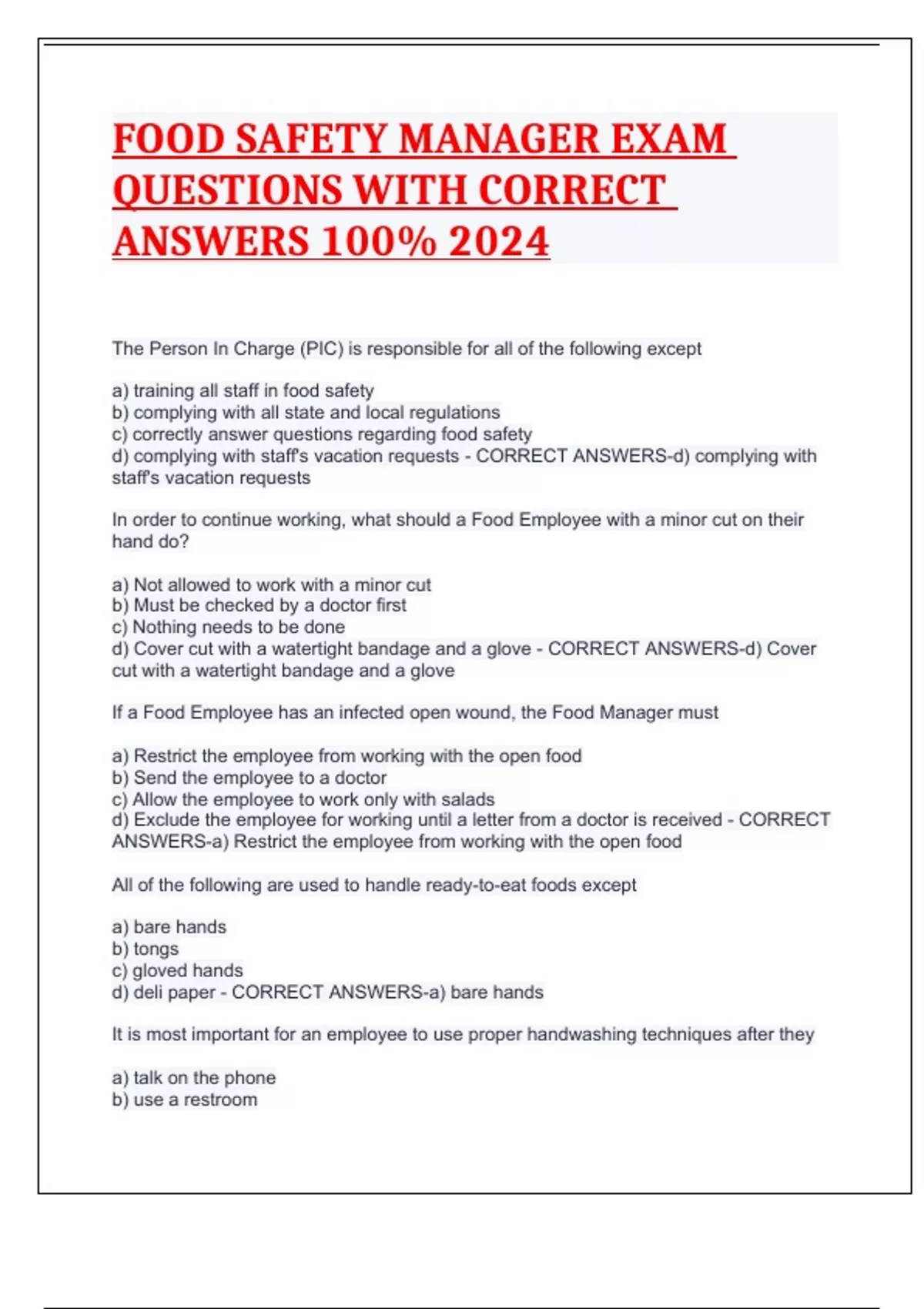 FOOD SAFETY MANAGER EXAM QUESTIONS WITH CORRECT ANSWERS 100% 2024