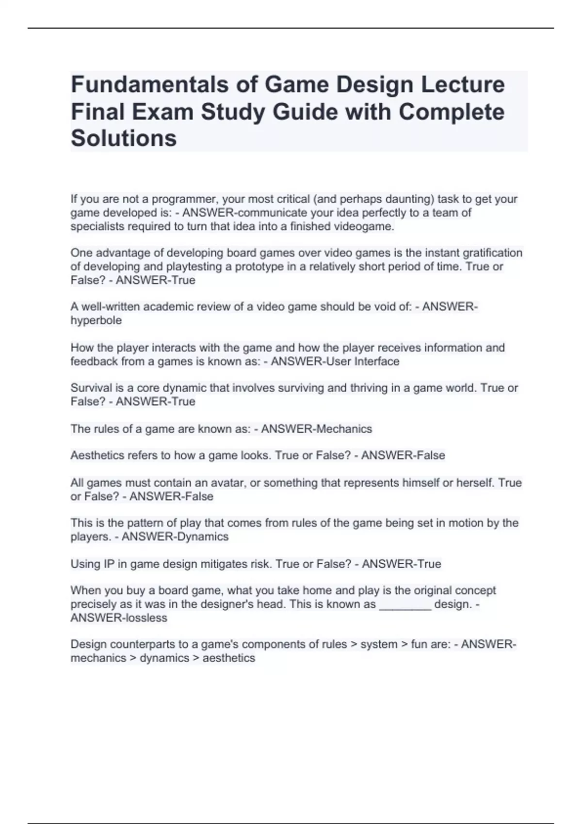 Fundamentals of Game Design Lecture Final Exam Study Guide with Complete SolutionsFundamentals of Game Design Lecture Final Exam Study Guide with Complete SolutionsFundamentals of Game Design Lecture Final Exam Study Guide with Complete SolutionsFundamentals of Game Design Lecture Final Exam Study Guide with Complete Solutions If you are not a programmer, your most critical (and perhaps daunting) task to get your game developed is: - ANSWER-communicate your idea perfectly to a team of specialists required to turn that idea into a finished videogame. One advantage of developing board games over video games is the instant gratification of developing and playtesting a prototype in a relatively short period of time. True or False? - ANSWER-True A well-written academic review of a video game should be void of: - ANSWER-hyperbole