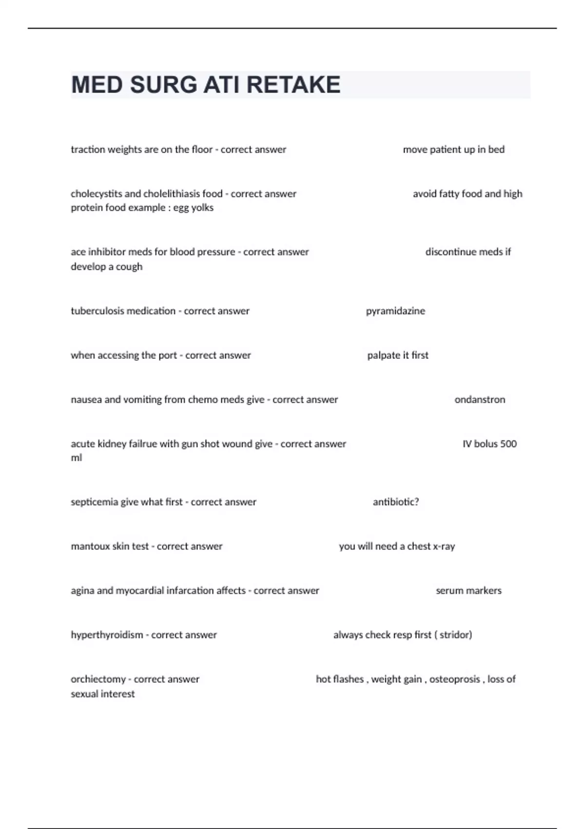 traction weights are on the floor - correct answer move patient up in bed cholecystits and cholelithiasis food - correct answer avoid fatty food and high protein food example : egg yolks ace inhibitor meds for blood pressure - correct answer discontinue meds if develop a cough tuberculosis medication - correct answer pyramidazine when accessing the port - correct answer palpate it first nausea and vomiting from chemo meds give - correct answer ondanstron acute kidney failrue with gun shot wound give - correct answer IV bolus 500 ml septicemia give what first - correct answer antibiotic? mantoux skin test - correct answer you will need a chest x-ray agina and myocardial infarcation affects - correct answer serum markers hyperthyroidism - correct answer always check resp first ( stridor) orchiectomy - correct answer hot flashes , weight gain , osteoprosis , loss of sexual interest illeostomy - correct answer stools will be loose trach care - correct answer clean cannula with 1/2 hydrogen peroxide catheter care - correct answer tape to inner leg wound complications - correct answer purlent drainage from the site tb put patient into - correct answer negative pressure room treat a fib meds - correct answer amidirone after peritoneal dialysis report - correct answer rigid abdomen cardio procedures always be doing what - correct answer monitoring vital signs for osteoprosis increase - correct answer weight bearing exercises systemic lupus - correct answer joint pain acute and chronic glomerulonephritis - correct answer prioteinnuria peptic ulcer disease - correct answer right shoulder pain head injury priority - correct answer change in level of consciousness syphillis treatment - correct answer follow up 3 times in 24 months for blood test never hang blood - correct answer over 4 hours cardiac catherization - correct answer keep leg extended