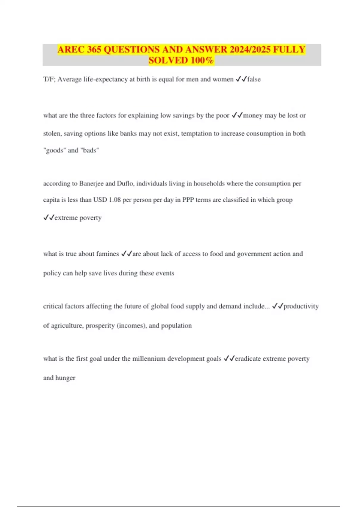 AREC 365 QUESTIONS AND ANSWER 2024/2025 FULLY SOLVED 100% T/F; Average life-expectancy at birth is equal for men and women false what are the three factors for explaining low savings by the poor money may be lost or stolen, saving options like banks may not exist, temptation to increase consumption in both "goods" and "bads" according to Banerjee and Duflo, individuals living in households where the consumption per capita is less than USD 1.08 per person per day in PPP terms are classified in which group extreme poverty what is true about famines are about lack of access to food and government action and policy can help save lives during these events critical factors affecting the future of global food supply and demand include... productivity of agriculture, prosperity (incomes), and population what is the first goal under the millennium development goals eradicate extreme poverty and hunger