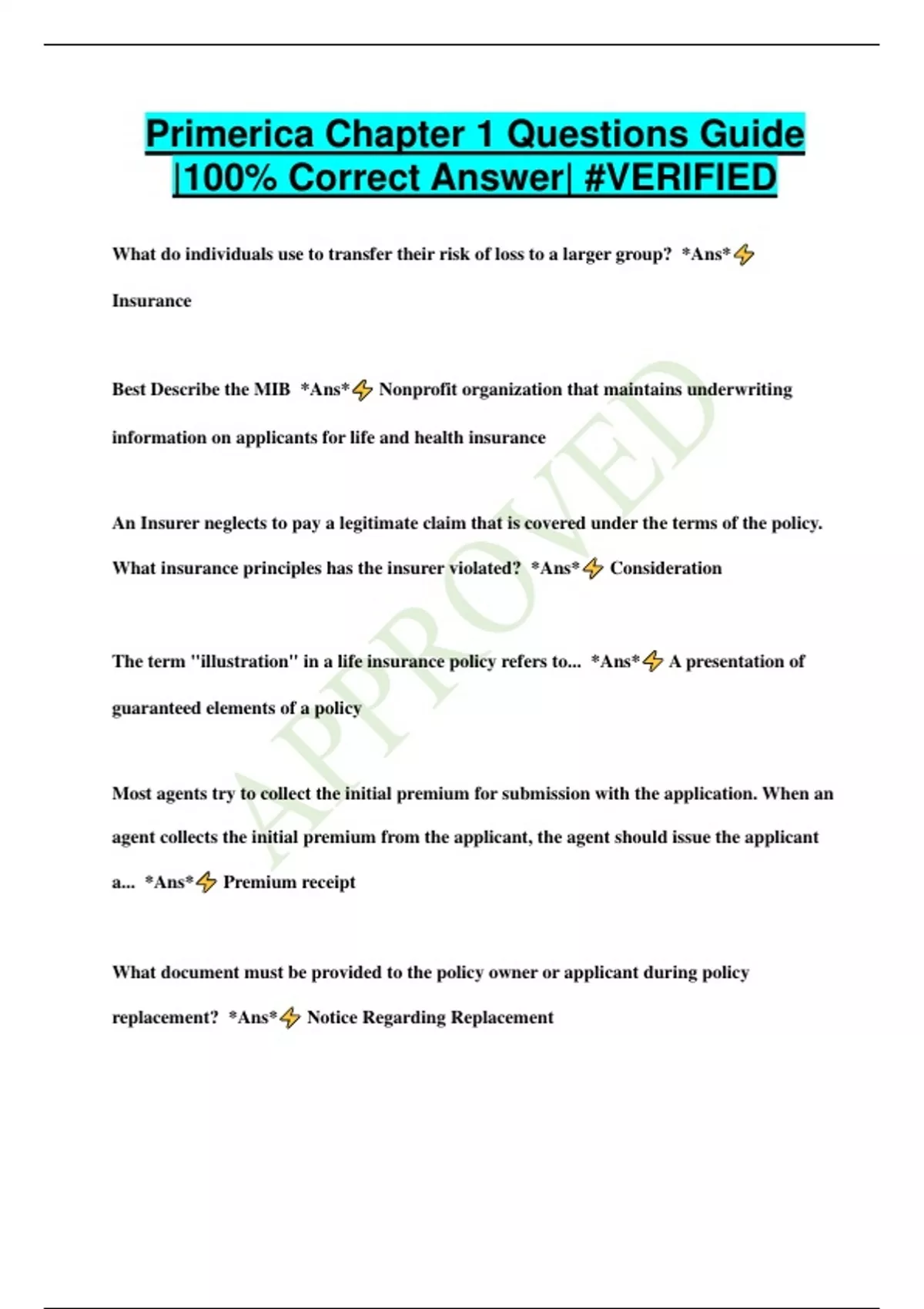 Primerica Chapter 1 Questions Guide |100% Correct Answer| #VERIFIED What do individuals use to transfer their risk of loss to a larger group? *Ans* Insurance Best Describe the MIB *Ans* Nonprofit organization that maintains underwriting information on applicants for life and health insurance An Insurer neglects to pay a legitimate claim that is covered under the terms of the policy. What insurance principles has the insurer violated? *Ans* Consideration The term "illustration" in a life insurance policy refers to... *Ans* A presentation of guaranteed elements of a policy Most agents try to collect the initial premium for submission with the application. When an agent collects the initial premium from the applicant, the agent should issue the applicant a... *Ans* Premium receipt What document must be provided to the policy owner or applicant during policy replacement? *Ans* Notice Regarding Replacement In insurance, an offer is usually made when... *Ans* the application is submitted When must insurable interest exist in a life insurance policy? *Ans* At the time of application What is the purpose of a conditional receipt? *Ans* It is intended to provide coverage on a date earlier than the date of the issuance of