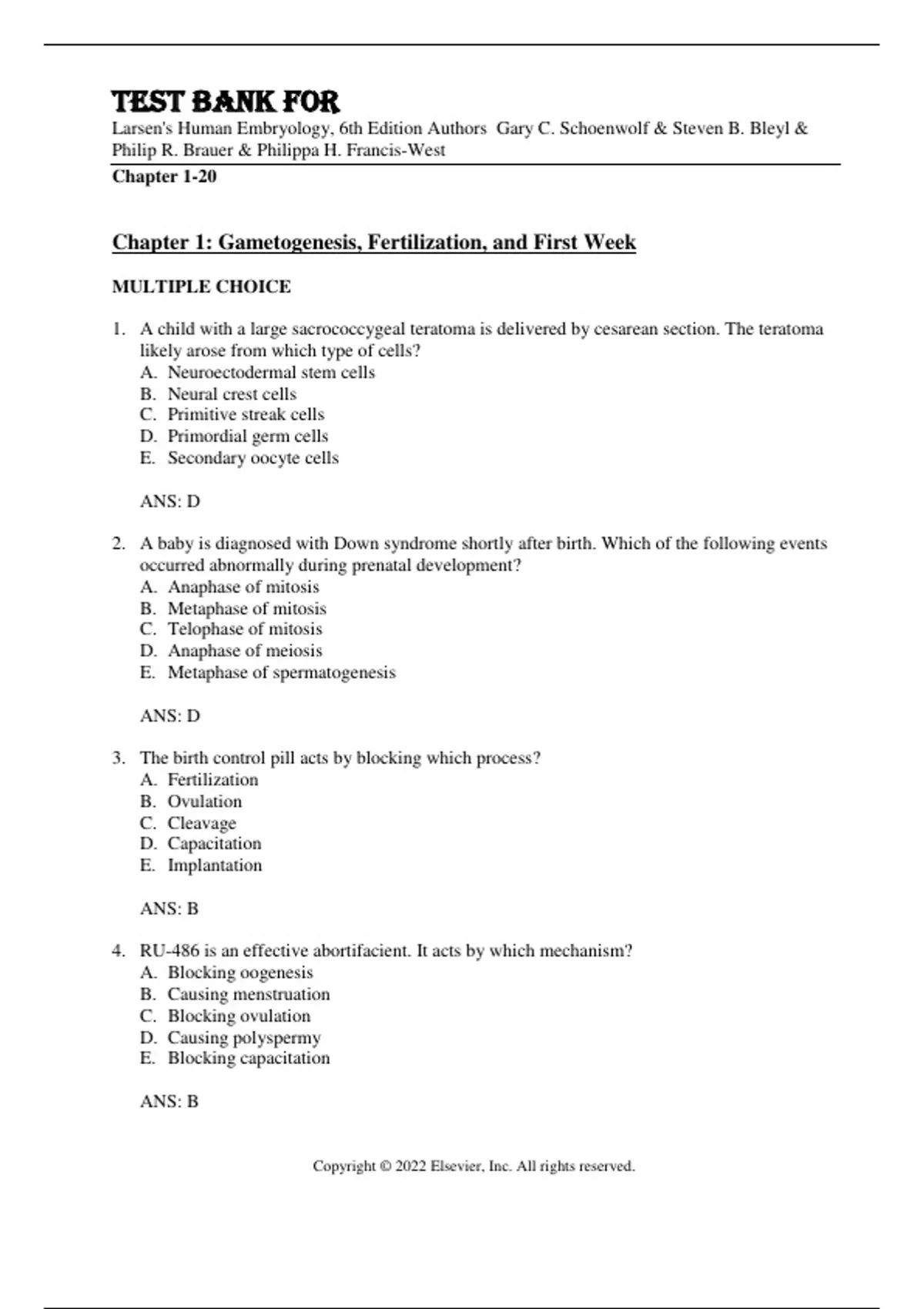 Test Bank For Larsen's Human Embryology, 6th Edition by Authors Gary C. Schoenwolf & Steven B. Bleyl & Philip R. Brauer & Philippa H. Francis-West Chapter 1-20