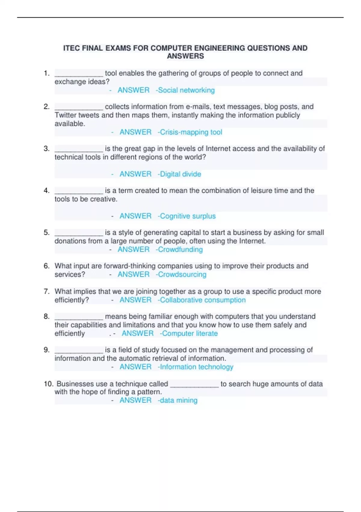 ITEC FINAL EXAMS FOR COMPUTER ENGINEERING QUESTIONS AND ANSWERS 1. ____________ tool enables the gathering of groups of people to connect and exchange ideas? - ANSWER -Social networking 2. ____________ collects information from e-mails, text messages, blog posts, and Twitter tweets and then maps them, instantly making the information publicly available. - ANSWER -Crisis-mapping tool 3. ____________ is the great gap in the levels of Internet access and the availability of technical tools in different regions of the world? - ANSWER -Digital divide 4. ____________ is a term created to mean the combination of leisure time and the tools to be creative. - ANSWER -Cognitive surplus 5. ____________ is a style of generating capital to start a business by asking for small donations from a large number of people, often using the Internet. - ANSWER -Crowdfunding 6. What input are forward-thinking companies using to improve their products and services? - ANSWER -Crowdsourcing 7. What implies that we are joining together as a group to use a specific product more efficiently? - ANSWER -Collaborative consumption 8. ____________ means being familiar enough with computers that you understand their capabilities and limitations and that you know how to use them safely and efficiently . - ANSWER -Computer literate 9. ____________ is a field of study focused on the management and processing of information and the automatic retrieval of information. - ANSWER -Information technology 10. Businesses use a technique called ____________ to search huge amounts of data with the hope of finding a pattern. - ANSWER -data mining 11.A law enforcement specialty called ____________ analyzes computer systems with specific techniques to gather potential legal evidence. - ANSWER -computer forensics 12.What combines our normal sense of the world around us with an additional layer of digital information? - ANSWER -augmented reality 13.What is a developing system that can recognize and simulate human emotions? - ANSWER -affective computing 14.Politicians worldwide are incorporating social networking as part of their political strategy. - ANSWER -true 15.Yatterbox is an example of a crisis-mapping tool that collects information from emails, text messages, blog posts, and Twitter tweets and then maps them, instantly making the information publicly available. - ANSWER -false 16.The term coined for the great gap in the levels of Internet access and the availability of technical tools in different regions of the world is collaborative consumption. - ANSWER -false 17.Cognitive surplus means the combination of leisure time and the tools to be creative. - ANSWER -true 18.Kickstarter is an example of crowdsourcing. - ANSWER -false 19.QR (quick response) codes lets any piece of print host a link to online information and video content. - ANSWER -true 20.Subscription-style business models are examples of collaborative consumption. - ANSWER -true 21.Spam is a good example of an online annoyance. - ANSWER -true 22.Finding information and finding good information on the web are two different things. - ANSWER -true