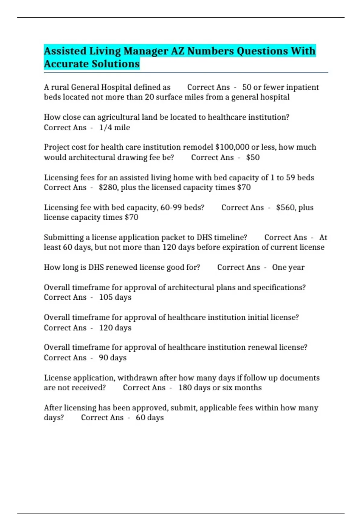 Assisted Living Manager AZ Numbers Questions With Accurate Solutions
