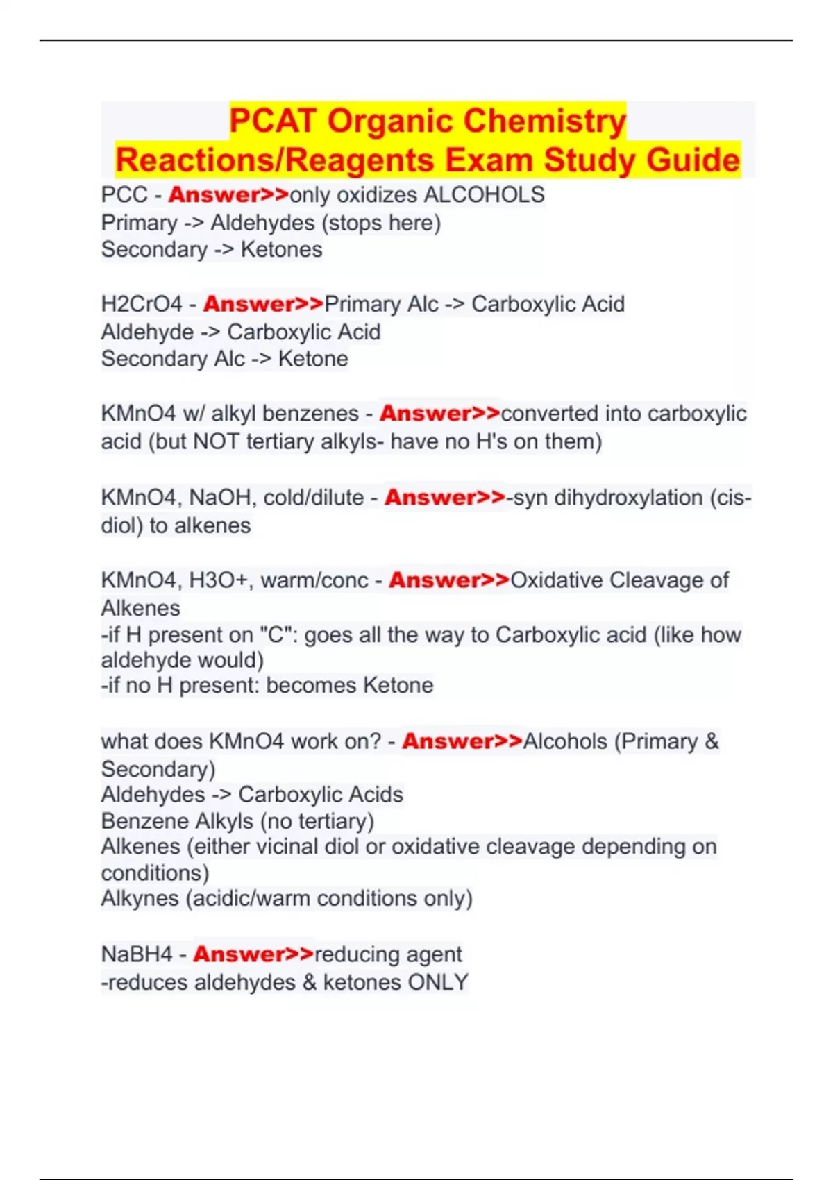 PCAT Organic Chemistry Reactions/Reagents Exam Study Guide