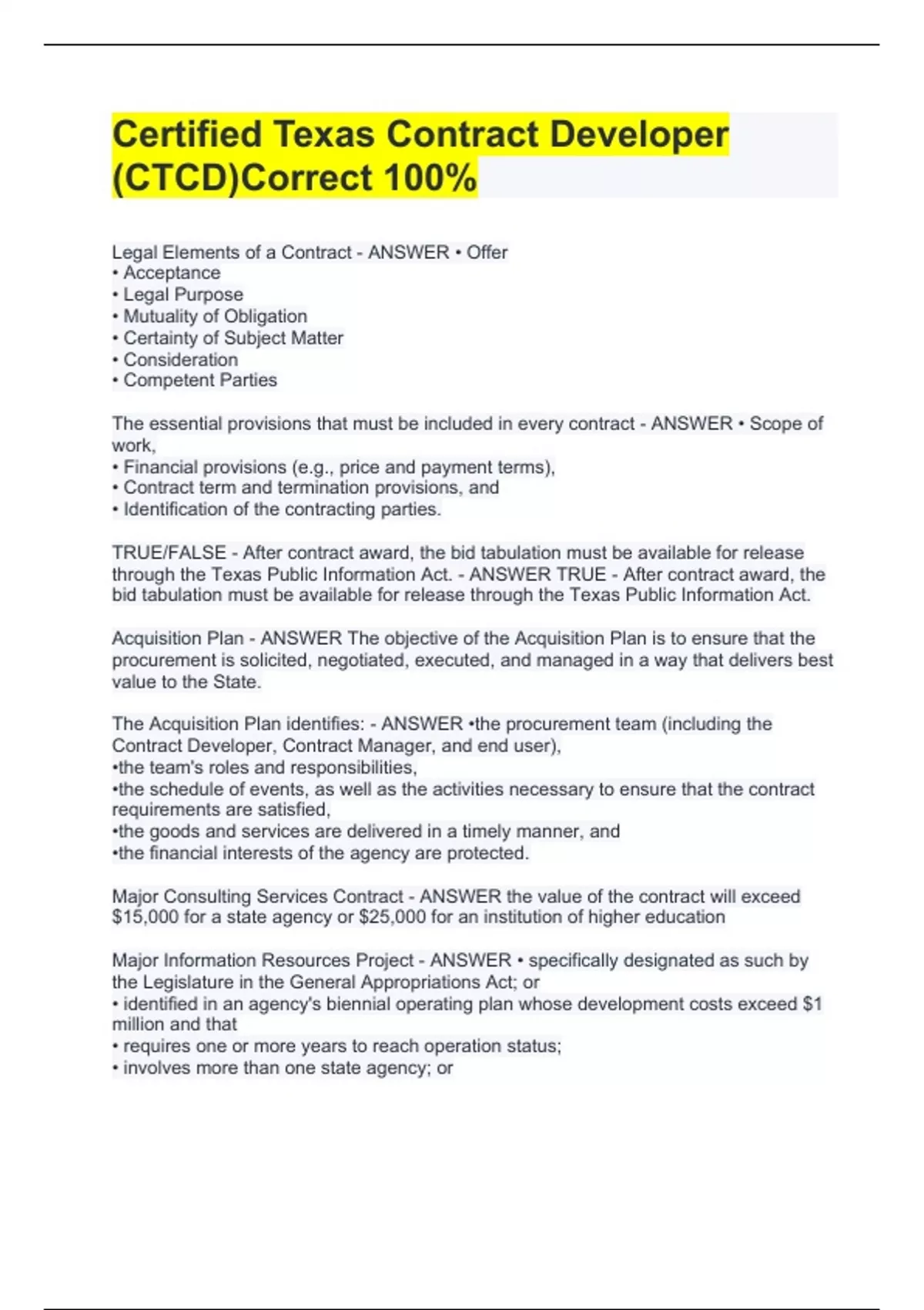 Legal Elements of a Contract - ANSWER • Offer • Acceptance • Legal Purpose • Mutuality of Obligation • Certainty of Subject Matter • Consideration • Competent Parties The essential provisions that must be included in every contract - ANSWER • Scope of work, • Financial provisions (e.g., price and payment terms), • Contract term and termination provisions, and • Identification of the contracting parties. TRUE/FALSE - After contract award, the bid tabulation must be available for release through the Texas Public Information Act. - ANSWER TRUE - After contract award, the bid tabulation must be available for release through the Texas Public Information Act. Acquisition Plan - ANSWER The objective of the Acquisition Plan is to ensure that the procurement is solicited, negotiated, executed, and managed in a way that delivers best value to the State. The Acquisition Plan identifies: - ANSWER •the procurement team (including the Contract Developer, Contract Manager, and end user), •the team's roles and responsibilities, •the schedule of events, as well as the activities necessary to ensure that the contract requirements are satisfied, •the goods and services are delivered in a timely manner, and •the financial interests of the agency are protected.