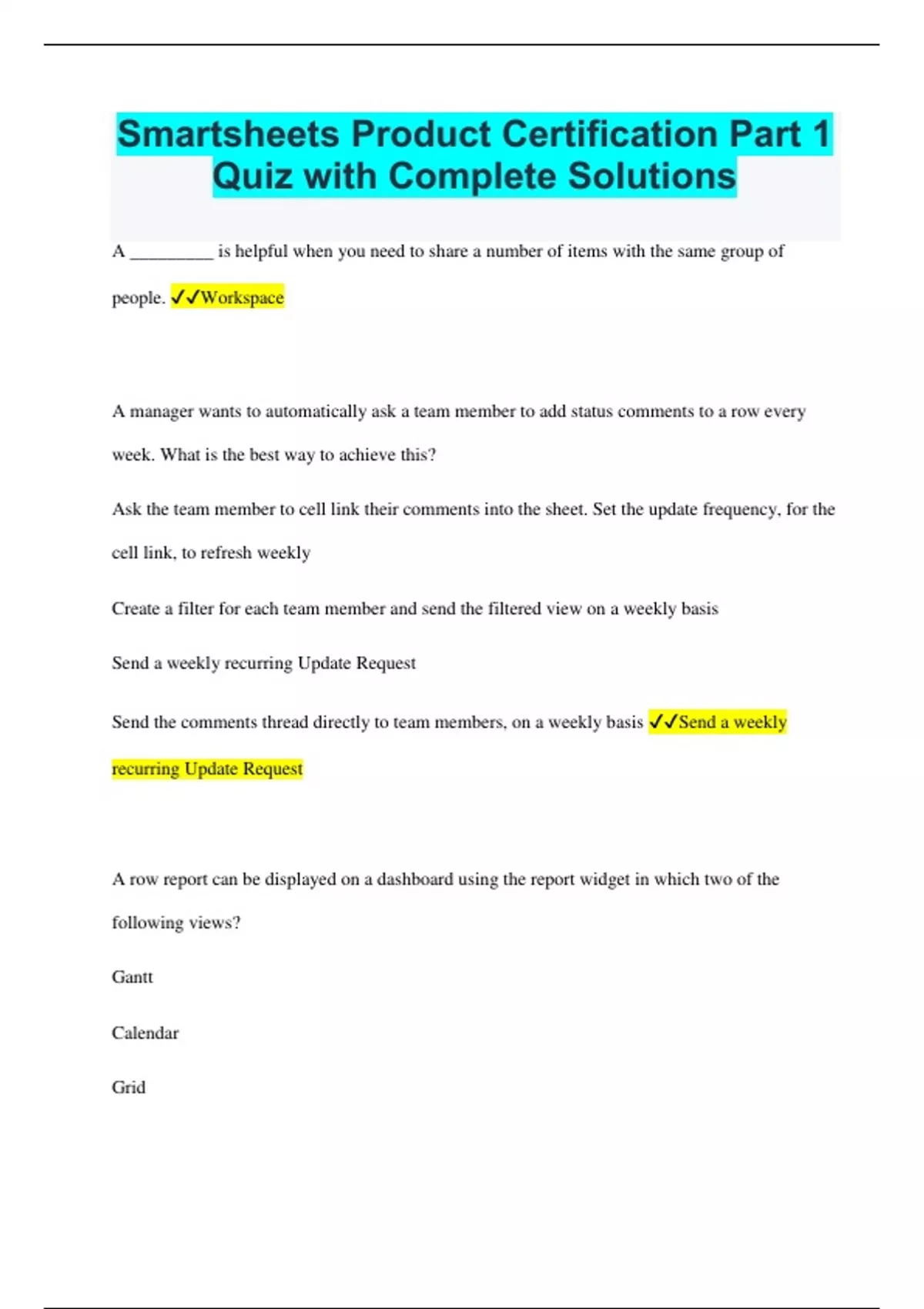 Smartsheets Product Certification Part 1 Quiz with Complete Solutions A _________ is helpful when you need to share a number of items with the same group of people. Workspace A manager wants to automatically ask a team member to add status comments to a row every week. What is the best way to achieve this? Ask the team member to cell link their comments into the sheet. Set the update frequency, for the cell link, to refresh weekly Create a filter for each team member and send the filtered view on a weekly basis Send a weekly recurring Update Request Send the comments thread directly to team members, on a weekly basis Send a weekly recurring Update Request A row report can be displayed on a dashboard using the report widget in which two of the following views? Gantt Calendar Grid Card Gantt Card A snapshot of a sheet or report can be shared via email using the "Send as Attachment..." action. The sheet can be sent once or on a recurring basis. Select the two file formats the attachment can be sent as. CSV PNG Excel PDF Excel PDF Alerts with date-based triggers help keep collaborators aware of key dates. Which of the following is a possible use-case for establishing an alert with a date as the trigger? You want to notify all collaborators when a task is over budget You want to be sent an email five days before the start of each task so that you can check in with key collaborators You want to automatically let external vendors know when a task is not complete You want to automatically inform your boss when the status of a task becomes at-risk You want to be sent an email five days before the start of each task so that you can check in with key collaborators An update request provides one-time Editor access. What feature could be used to allow information to be included in an update request, but restrict the recipient from making changes? Change sharing permissions Lock column Conditional formatting Filters Lock column As the owner of a sheet, you would like to provide an external collaborator the ability to update their tasks regularly, but not have access to the underlying sheet. Which of the below actions meets this requirement? Send a row Schedule a recurring update request Share them to the sheet as a viewer Publish a "Edit by anyone" link Schedule a recurring