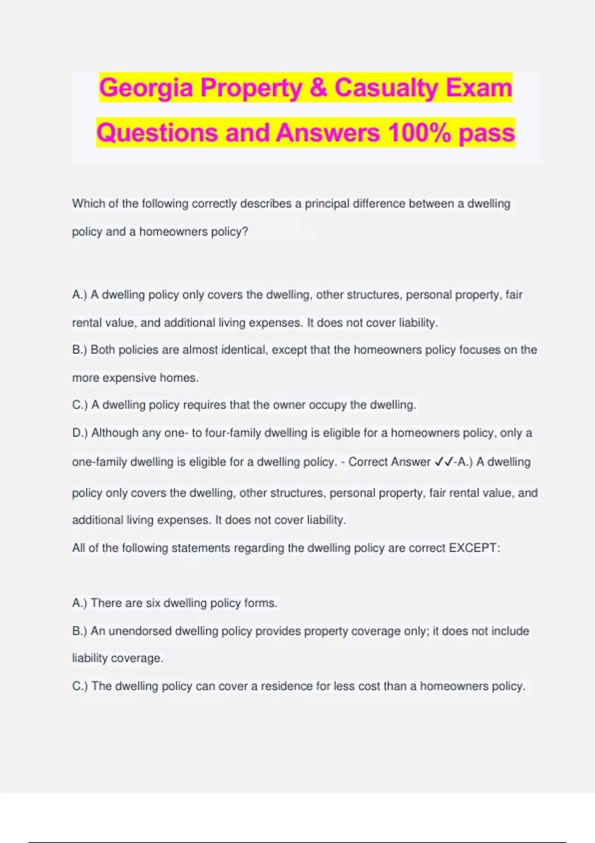 Georgia Property & Casualty Exam Questions and Answers 100% pass Which of the following correctly describes a principal difference between a dwelling policy and a homeowners policy? A.) A dwelling policy only covers the dwelling, other structures, personal property, fair rental value, and additional living expenses. It does not cover liability. B.) Both policies are almost identical, except that the homeowners policy focuses on the more expensive homes. C.) A dwelling policy requires that the owner occupy the dwelling. D.) Although any one- to four-family dwelling is eligible for a homeowners policy, only a one-family dwelling is eligible for a dwelling policy. - Correct Answer ️️ -A.) A dwelling policy only covers the dwelling, other structures, personal property, fair rental value, and additional living expenses. It does not cover liability. All of the following statements regarding the dwelling policy are correct EXCEPT: A.) There are six dwelling policy forms. B.) An unendorsed dwelling policy provides property coverage only; it does not include liability coverage. C.) The dwelling policy can cover a residence for less cost than a homeowners policy. D.) The dwelling policy covers personal property as well as the dwelling itself. - Correct Answer ️️ -A.) There are six dwelling policy forms. There are actually only three: basic, broad, and special. What endorsement should Jeffrey's Flowers add to its commercial property policy if it wants coverage for breakdown or contamination and power outage? A.) Ordinance or Law B.) Peak Season C.) Spoilage Coverage D.) Value Reporting Form - Correct Answer ️️ -C.) Spoilage Coverage Most insurance regulation is conducted by the: A.) Federal Insurance Office B.) U.S. Congress C.) U.S. Department of Health, Education and Welfare D.) State Government Agencies - Correct Answer ️️ -D.) State Government Agencies Which of the following is an example of adverse selection? A.) an applicant who just bought a new car and wants to buy the least expensive auto policy B.) a homeowner who wants to meet with her agent to discuss her current coverages following some recent home improvements C.) an applicant whose business was recently burglarized deciding he had better buy some commercial crime insurance coverage D.) a business owner who decides to cancel his business owner's policy because he believes he can financially handle any losses that might occur - Correct Answer ️️ -C.) an applicant whose business was recently burglarized deciding he had better buy some commercial crime insurance coverage When comparing her insurance company's policies to those of Zenith Insurance, Melanie makes a misleading statement to convince an insurance prospect to terminate a policy with Zenith and buy one from Melanie's company. Melanie has engaged in: A.) Twisting B.) Rebating C.) Unfair discrimination D.) Defamation - Correct Answer ️️ -A.) Twisting Stuart receives a notice from his insurance company telling him that his policy will be terminated at the end of the policy period. The notice provides a reason, which can be any of the following EXCEPT: A.) He filed a false claim. B.) He failed to disclose information necessary to properly rate the risk. C.) He failed to pay the premium. D.) He was in a traffic accident caused by another driver. - Correct Answer ️️ -D.) He was in a traffic accident caused by another driver. Which type of insurance company pays policy dividends to its policyowners? A.) stock insurance company B.) mutual insurance company C.) captive insurance company D.) reinsurance company - Correct Answer ️️ -B.) mutual insurance company Which of the following would be recognized as a residence employee under the liability section of a homeowners policy? A.) the insured's CPA who is meeting at the insured's home to review business tax plans B.) the insured's gardener who lives in a small cottage on the insured's land C.) the insured who works out of her home D.) an independent contractor hired by the insured to construct a new addition to the insured's home - Correct Answer ️️ -B.) the insured's gardener who lives in a small cottage on the insured's land What are the two types of compensatory damages? A.) special and punitive B.) special and general C.) general and punitive D.) specific and general - Correct Answer ️️ -B.) special and general Smith received $20,000 in premiums from his clients and used half of the funds to buy a new entertainment system for his office. Which of the following penalties may be imposed for this misconduct? A.) License suspension for up to six months B.) Restitution C.) Felony conviction D.) Fine of up to $50,000 - Correct Answer ️️ -C.) Felony conviction Fire is a named peril that may be designated as "friendly" or "hostile." All of