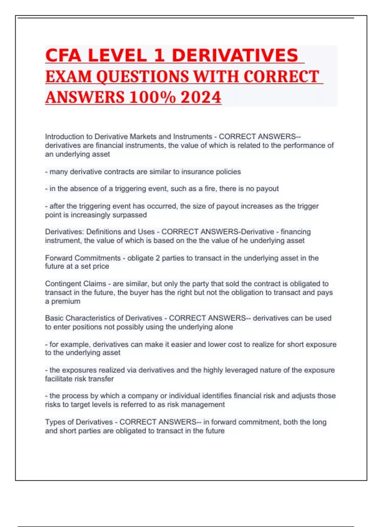 CFA LEVEL 1 DERIVATIVES EXAM QUESTIONS WITH CORRECT ANSWERS 100% 2024