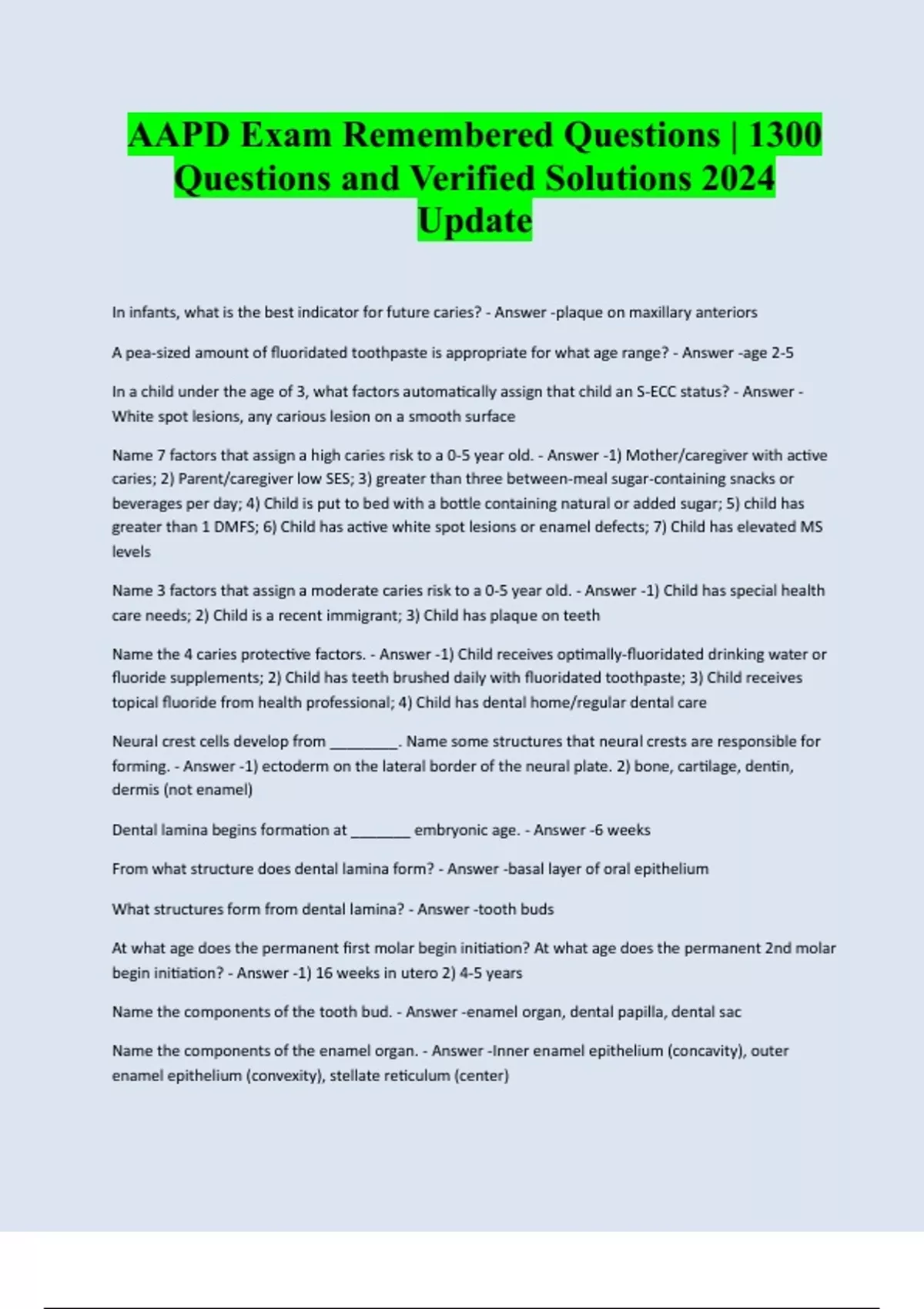 AAPD Exam Remembered Questions | 1300 Questions and Verified Solutions 2024 Update In infants, what is the best indicator for future caries? - Answer -plaque on maxillary anteriors A pea-sized amount of fluoridated toothpaste is appropriate for what age range? - Answer -age 2-5 In a child under the age of 3, what factors automatically assign that child an S-ECC status? - Answer - White spot lesions, any carious lesion on a smooth surface Name 7 factors that assign a high caries risk to a 0-5 year old. - Answer -1) Mother/caregiver with active caries; 2) Parent/caregiver low SES; 3) greater than three between-meal sugar-containing snacks or beverages per day; 4) Child is put to bed with a bottle containing natural or added sugar; 5) child has greater than 1 DMFS; 6) Child has active white spot lesions or enamel defects; 7) Child has elevated MS levels Name 3 factors that assign a moderate caries risk to a 0-5 year old. - Answer -1) Child has special health care needs; 2) Child is a recent immigrant; 3) Child has plaque on teeth Name the 4 caries protective factors. - Answer -1) Child receives optimally-fluoridated drinking water or fluoride supplements; 2) Child has teeth brushed daily with fluoridated toothpaste; 3) Child receives topical fluoride from health professional; 4) Child has dental home/regular dental care Neural crest cells develop from ________. Name some structures that neural crests are responsible for forming. - Answer -1) ectoderm on the lateral border of the neural plate. 2) bone, cartilage, dentin, dermis (not enamel) Dental lamina begins formation at _______ embryonic age. - Answer -6 weeks From what structure does dental lamina form? - Answer -basal layer of oral epithelium What structures form from dental lamina? - Answer -tooth buds At what age does the permanent first molar begin initiation? At what age does the permanent 2nd molar begin initiation? - Answer -1) 16 weeks in utero 2) 4-5 years Name the components of the tooth bud. - Answer -enamel organ, dental papilla, dental sac Name the components of the enamel organ. - Answer -Inner enamel epithelium (concavity), outer enamel epithelium (convexity), stellate reticulum (center)