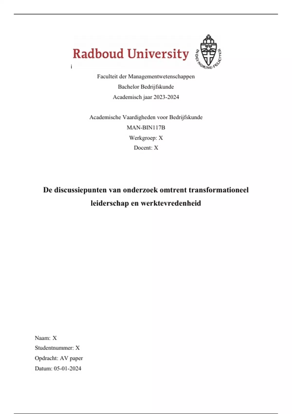 Paper voor AV afgerond met een 8, het paper gaat over de discussiepunten van onderzoek omtrent transformationeel leiderschap en werktevredenheid
