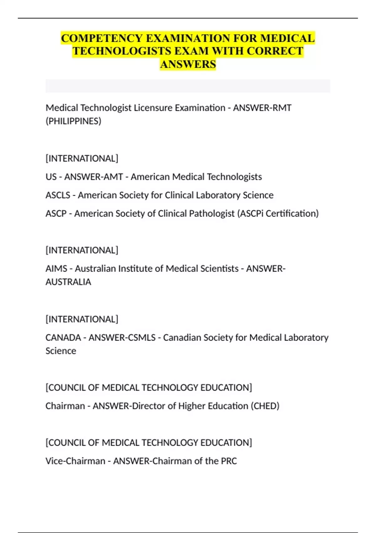 Medical Technologist Licensure Examination - ANSWER-RMT (PHILIPPINES) [INTERNATIONAL] US - ANSWER-AMT - American Medical Technologists ASCLS - American Society for Clinical Laboratory Science ASCP - American Society of Clinical Pathologist (ASCPi Certification) [INTERNATIONAL] AIMS - Australian Institute of Medical Scientists - ANSWER-AUSTRALIA [INTERNATIONAL] CANADA - ANSWER-CSMLS - Canadian Society for Medical Laboratory Science [COUNCIL OF MEDICAL TECHNOLOGY EDUCATION] Chairman - ANSWER-Director of Higher Education (CHED) [COUNCIL OF MEDICAL TECHNOLOGY EDUCATION] Vice-Chairman - ANSWER-Chairman of the PRC Director of the Bureau of Research and Laboratories of the Department of Health [COUNCIL OF MEDICAL TECHNOLOGY EDUCATION] MEMBERS - ANSWER-Dean of the Institute of Hygiene of the University of the Philippine A representative of the deans or heads of the private schools of medical technology Presidents of the Philippine Association of Medical Technologists and the Philippine Society of Pathologists MINIMUM REQUIRED COURSE - ANSWER-At least four years 12-month satisfactory internship [BOARD OF MEDICAL TECHNOLOGY] CHAIRMAN - ANSWER-Pathologist [BOARD OF MEDICAL TECHNOLOGY] 2 MEMBERS - ANSWER-RMTs 1ST BOARD OF MEDICAL TECHNOLOGY - ANSWER-Dr. Arturo D. Tolentino, Jr (CHAIRMAN) Mr. Felix E. Asprer and Ms. Azucena S. J. Vizconde (MEMBERS) 1ST EXAMINATION - ANSWER-September 1970 25% of examinees passed PRESENT MEDICAL TECHNOLOGY BOARD - ANSWER-MARILYN A. CABAN-BANZA (CHAIRMAN) MARILYN R. ATIENZA & MARIAN M. TANTINGCO (MEMBERS) LICENSURE EXAMINATION (when; month) - ANSWER-Semi-annually during the months of March and August Law: March & September QUALIFICATIONS FOR EXAMINATION - ANSWER-• Good Health • Good Moral Character • Has completed a course of at least four years SCOPE OF EXAMINATION [20%] - ANSWER-Clinical Chemistry Microbiology & Parasitology Hematology Blood Banking & Serology SCOPE OF EXAMINATION [10%] - ANSWER-Clinical Microscopy (Urinalysis and other body fluids) Histopathologic Techniques, Cytotechnology, Medical Technology Laws, Related Laws and its implementing rules, and the Code of Ethics REPORT OF RATING - ANSWER-120 days after the date of completion of the examinations RATING IN THE EXAMINATION - ANSWER-General average: 75% No rating below 50% in any of the major subjects Has not failed in at least 60% of the subjects OATH TAKING - ANSWER-All successful examinees shall be required to take a professional oath prior to entering upon the practice of medical technology in the Philippines Issuance of Certificate of Registration: 21 years old