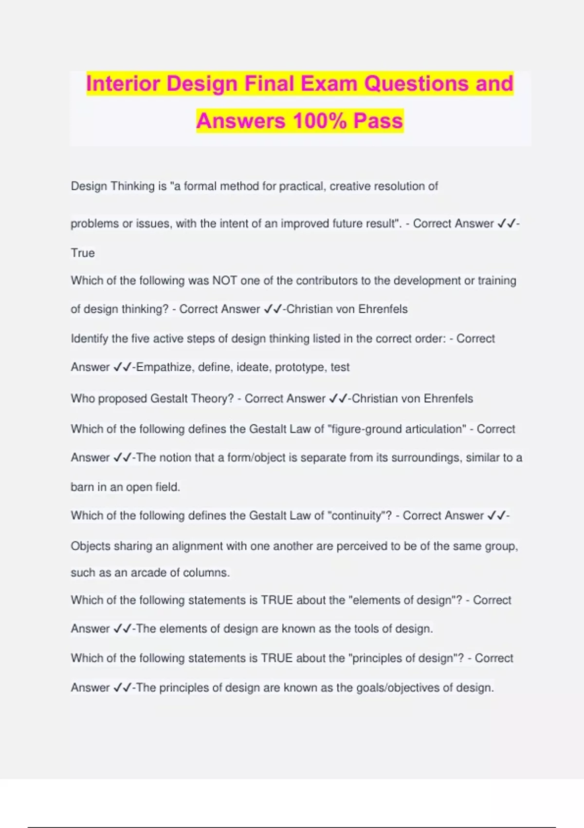 Interior Design Final Exam Questions and Answers 100% Pass Design Thinking is "a formal method for practical, creative resolution of problems or issues, with the intent of an improved future result". - Correct Answer ️️ - True Which of the following was NOT one of the contributors to the development or training of design thinking? - Correct Answer ️️ -Christian von Ehrenfels Identify the five active steps of design thinking listed in the correct order: - Correct Answer ️️ -Empathize, define, ideate, prototype, test Who proposed Gestalt Theory? - Correct Answer ️️ -Christian von Ehrenfels Which of the following defines the Gestalt Law of "figure-ground articulation" - Correct Answer ️️ -The notion that a form/object is separate from its surroundings, similar to a barn in an open field. Which of the following defines the Gestalt Law of "continuity"? - Correct Answer ️️ - Objects sharing an alignment with one another are perceived to be of the same group, such as an arcade of columns. Which of the following statements is TRUE about the "elements of design"? - Correct Answer ️️ -The elements of design are known as the tools of design. Which of the following statements is TRUE about the "principles of design"? - Correct Answer ️️ -The principles of design are known as the goals/objectives of design. Which of the following statements is FALSE about point? - Correct Answer ️️ -Point can be represented in built space by the intersection of two planes. Which of the following statements about lines is FALSE? - Correct Answer ️️ - Curvilinear lines tend to create tension and evoke strong emotions within a space Which of the following describes "pattern"? - Correct Answer ️️ -Utilizing a certain geometry, or combinations of geometries, repeatedly, even formulaically. Which of the following describes "texture"? - Correct Answer ️️ -Utilizing randomness this idea adds visual interest, beauty, and character to a space while also altering the way light reflects from its surface. Which of the following describes "scale"? - Correct Answer ️️ -Addresses the size of a space or object in comparison to what we would expect it to be based on some accepted standard, typically the human body. Which of the following is TRUE in relation to "color"? - Correct Answer ️️ -A tint is achieved by adding white to a hue, and a shade is achieved when adding black to a hue Which of the following is FALSE in relation to "light"? - Correct Answer ️️ -Electric light is grouped into three categories: natural, accent, and task. Which of the following describes "proportion"? - Correct Answer ️️ -Deals with the dimensions of an object, or space, in relation to itself. Which of the following are systems of proportion? - Correct Answer ️️ -Golden mean/golden section, Fibonacci Series, Le Modular Which of the following describes "balance"? - Correct Answer ️️ -The quality that expresses a natural resting posture, or equilibrium, in a space Which of the following describes "rhythm"? - Correct Answer ️️ -Evokes a sense of movement as the eye traces various aspects of a design through a space Which of the following are levels of contrast in hierarchy? - Correct Answer ️️ - Dominant, sub-dominant, subordinate Books and art depicting destroyed buildings and interiors along with buildings, spaces, and furniture that have survived the ages give us an understanding of design history - Correct Answer ️️ -True Which of the following characterizes Egyptian design and architecture? - Correct Answer ️️ -Sun-dried brick, post and lintel openings, closely spaced columns, flat stone roofs Which of the following characterizes Greek design and architecture? - Correct Answer ️️ -Included 3 orders: Doric, Ionic, and Corinthian; pitched roofs, pediment and tympanum, and entablature lining the perimeter above columns Which of the following characterizes Roman design and architecture? - Correct Answer ️️ -Included 5 orders: Tuscan, Doric, Ionic, Corinthian, and Composite; pitched roofs, pediment and tympanum, and entablature lining the perimeter above columns Which of the following characterizes Byzantine design and architecture? - Correct Answer ️️ -Extensive use of marble, mosaic tile, fresco, and alabaster; multi-dome roof forms and round half-circle arches. Which of the following characterizes Romanesque design and architecture? - Correct Answer ️️ -Semi-circular arches, arcades of columns, groin vaults, articulated structural bays, and tripartite level arrangement; Latin cross church planning Which of the following characterizes Gothic design and architecture? - Correct Answer ️️ -Tall proportions, slender columns, increased daylight to interior; pointed arch, flying buttress, and curtain wall. Which of the following characterizes Renaissance design and architecture? - Correct Answer ️️ -Classical orders, semi-circular arches, broad spans, Golden Mean/Golden Section Which of the following characterizes Baroque design and architecture? - Correct Answer ️️ -Curvilinear, circular, elliptical forms; faux finishing, gilding, metal plating of architectural details The roots of modern design (or modernism) can be traced back to - Correct Answer ️️ -The Industrial Revolution in England. The transition between historic and modern design is credited to - Correct Answer ️️ - The Crystal Palace The BAUHAUS was... - Correct Answer ️️ -A school of design in Germany