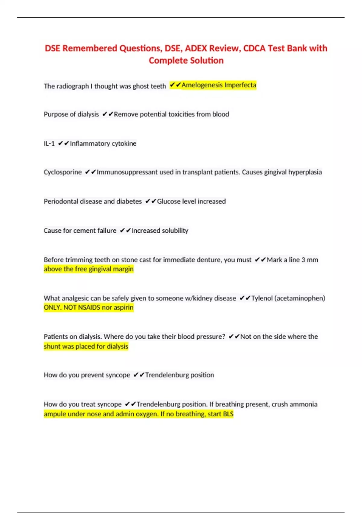 DSE Remembered Questions, DSE, ADEX Review, CDCA Test Bank with Complete Solution