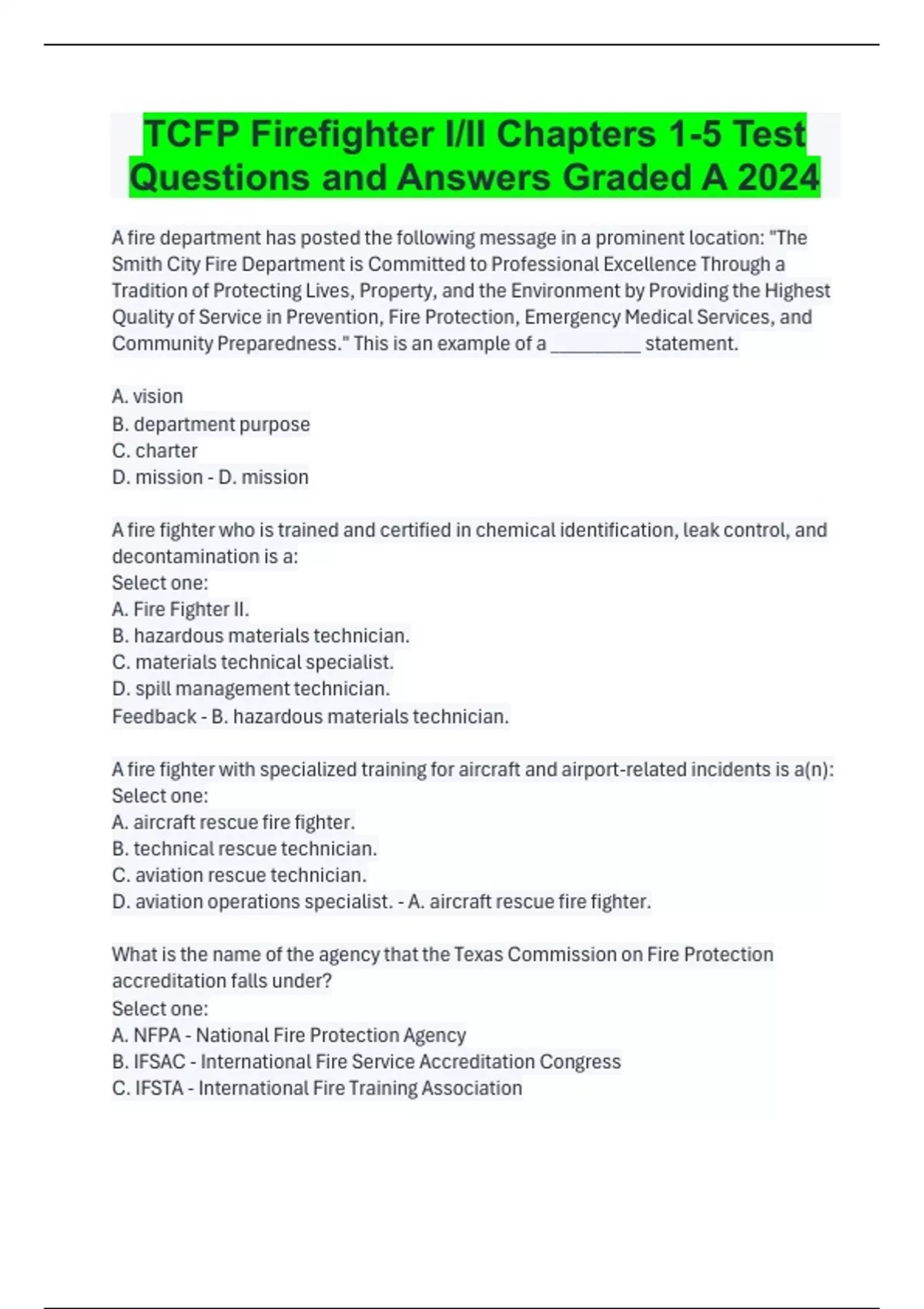A fire department has posted the following message in a prominent location: "The Smith City Fire Department is Committed to Professional Excellence Through a Tradition of Protecting Lives, Property, and the Environment by Providing the Highest Quality of Service in Prevention, Fire Protection, Emergency Medical Services, and Community Preparedness." This is an example of a __________ statement. A. vision B. department purpose C. charter D. mission - D. mission A fire fighter who is trained and certified in chemical identification, leak control, and decontamination is a: Select one: A. Fire Fighter II. B. hazardous materials technician. C. materials technical specialist. D. spill management technician. Feedback - B. hazardous materials technician. A fire fighter with specialized training for aircraft and airport-related incidents is a(n): Select one: A. aircraft rescue fire fighter. B. technical rescue technician. C. aviation rescue technician. D. aviation operations specialist. - A. aircraft rescue fire fighter. What is the name of the agency that the Texas Commission on Fire Protection accreditation falls under? Select one: A. NFPA - National Fire Protection Agency B. IFSAC - International Fire Service Accreditation Congress C. IFSTA - International Fire Training Association D. OSHA - Occupational Safety Health Administration - B. IFSAC - International Fire Service Accreditation Congress Texas Commission on Fire Protection certification testing consist of two parts. One being your Verification Skills and the other being the TCFP Written Exam. TCFP written exam is scheduled Fast Track Skills Session on 13th day and for the Saturday Session Skills the written exam is scheduled on a week day after last Saturday Session. For both classes when is the Verification Skills Sessions given? Select one: a. Verification Skills will only be given on scheduled burn days only. b. Verification Skills Testing are completed during 12 day Skills Session days. c. Verification Skills are competed on last day of Skills Session for both Saturday or Fast Track. d. Verification Skills are scheduled when student is ready. - b. Verification Skills Testing are completed during 12 day Skills Session days. The TCFP Written Exam is broken down into 4 categories, that are your IFSAC Seals what are they? Select one: a. Firefighter 1, Firefighter 2, Hazardous Materials Awareness, Hazardous Materials Operations. b. Firefighter 1, Firefighter 2, Driver Operator, Hazardous Materials Operations c. Firefighter, Hazardous Materials Operations, Hazardous Materials Awareness, Driver Operator d. Firefighter 1, Firefighter 2, Firefighter 3 and Hazards Materials Operations. - a. Firefighter 1, Firefighter 2, Hazardous Materials Awareness, Hazardous Materials Operations. If you fail TCFP Written Exam, how many days do you schedule your re-test? Select one: a. 14 days b. 365 days c. 12 days d. 180 days - d. 180 days