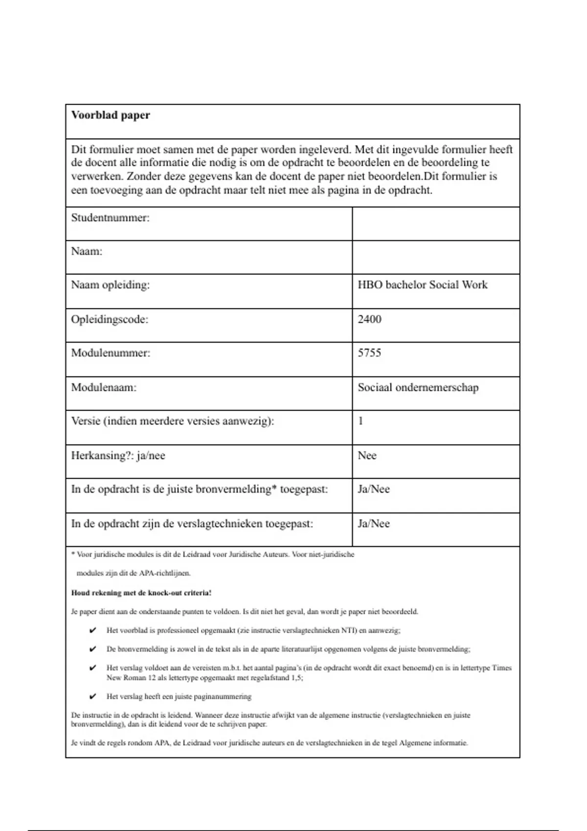 verwerken. Zonder deze gegevens kan de docent de paper niet beoordelen.Dit formulier is