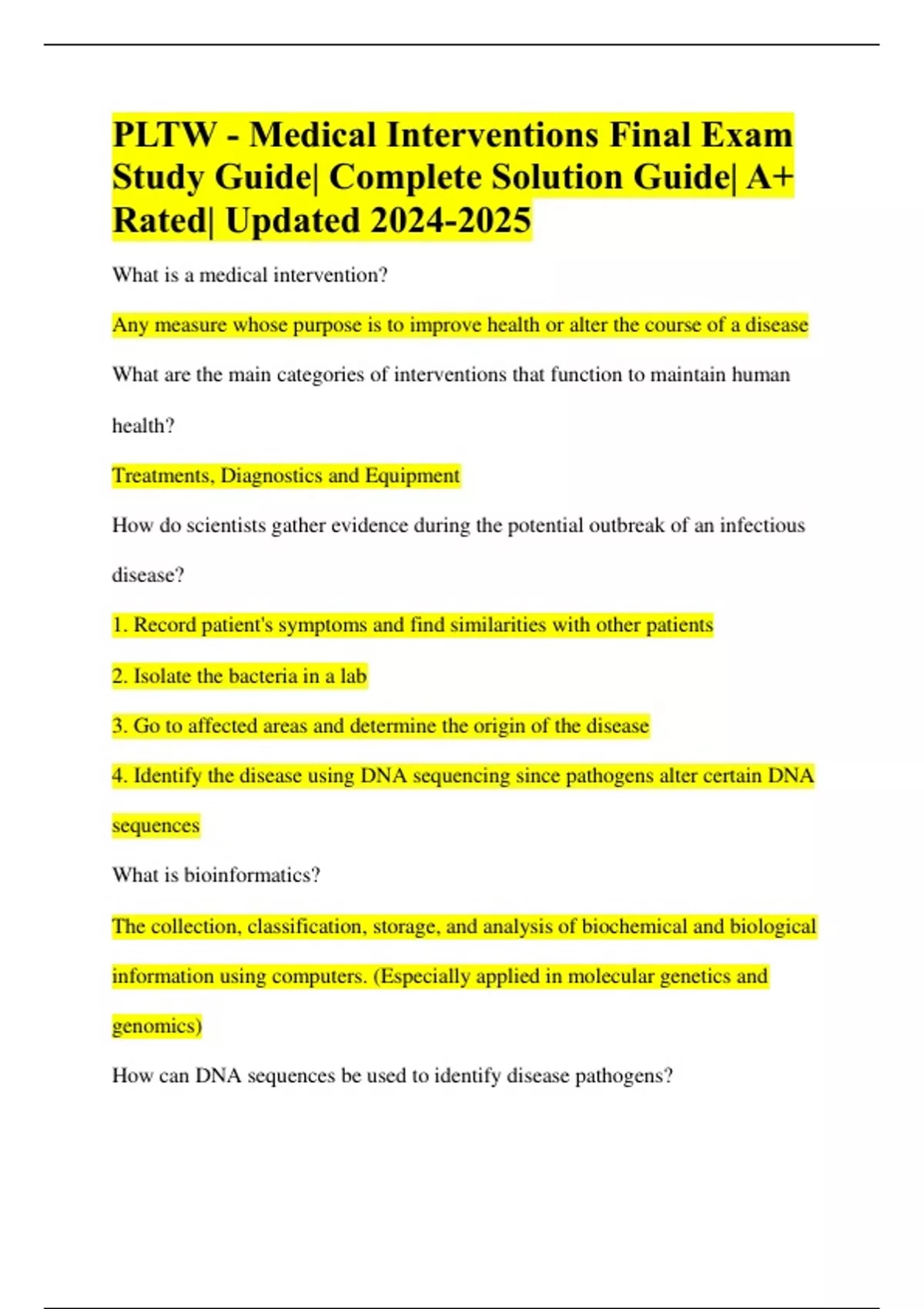 PLTW - Medical Interventions Final Exam Study Guide| Complete Solution Guide| A+ Rated| Updated What is a medical intervention? Any measure whose purpose is to improve health or alter the course of a disease What are the main categories of interventions that function to maintain human health? Treatments, Diagnostics and Equipment How do scientists gather evidence during the potential outbreak of an infectious disease? 1. Record patient's symptoms and find similarities with other patients 2. Isolate the bacteria in a lab 3. Go to affected areas and determine the origin of the disease 4. Identify the disease using DNA sequencing since pathogens alter certain DNA sequences What is bioinformatics? The collection, classification, storage, and analysis of biochemical and biological information using computers. (Especially applied in molecular genetics and genomics) How can DNA sequences be used to identify disease pathogens? You can observe mutations and abnormalities that disease pathogens have What is an antibody? A blood protein in the body produced by B-cells (B-Lymphocytes) that fight against a foreign substance by recognizing a specific part of it. How do antibodies identify and inactivate antigens? 1. Shape recognition 2. Proteins of the antigens are configured to specific antibodies, so the foreign antigens bind to the specific antibodies that inactivate them How can the ELISA assay be used to detect disease? 1. Primary antibodies attach to specific antigen 2. Secondary antibody attaches to primary antibody 3. When enzyme substrate is added, color change occurs Why is it important for doctors to know the concentration of the disease antigen present in a patient's system?